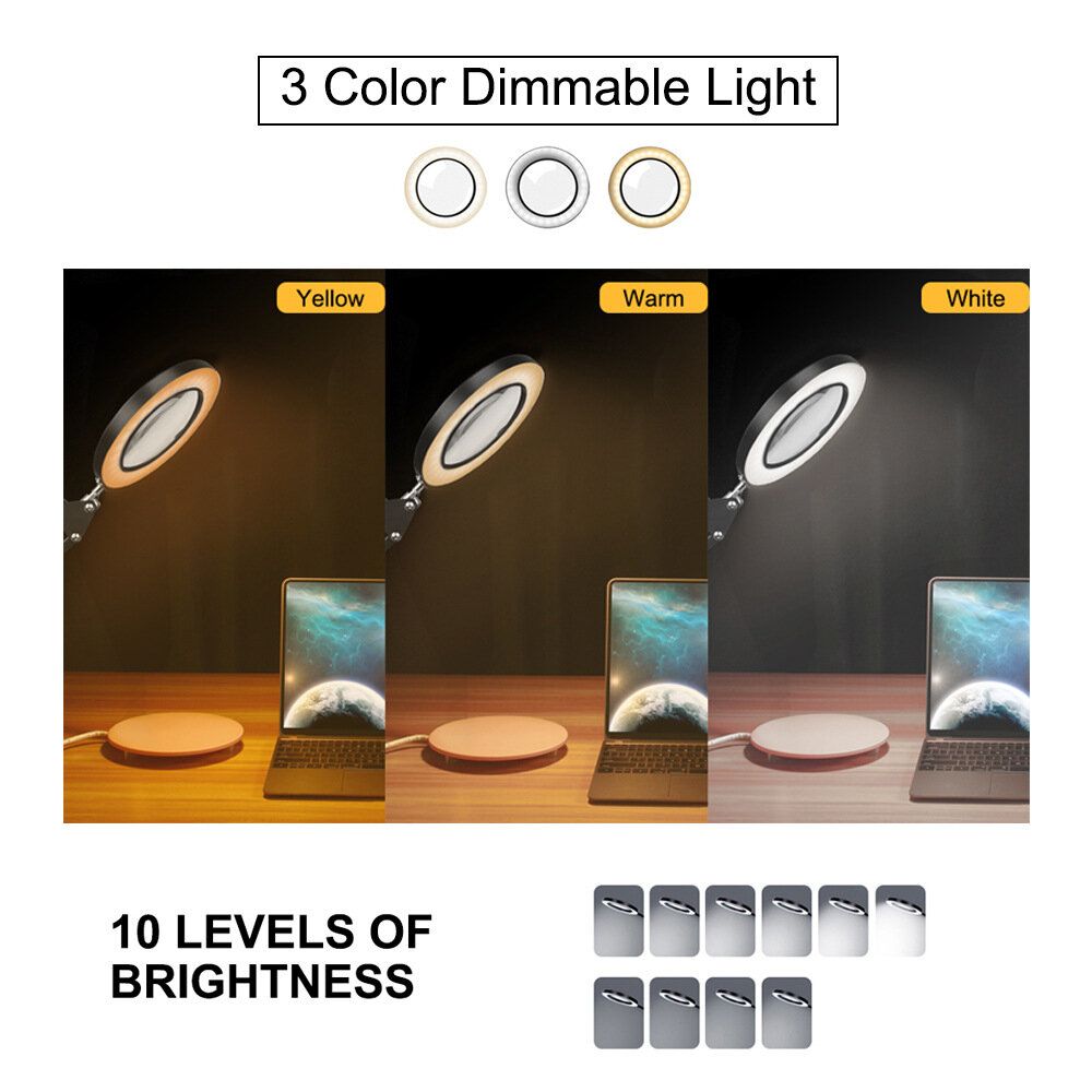 LED Magnifying Lamp: This magnifying lamp is equipped with 64 surface-mounted LED lights, offering three adjustable color temperatures (white/warm/yellow) and 10 levels of brightness. It provides optimal lighting for various working environments.