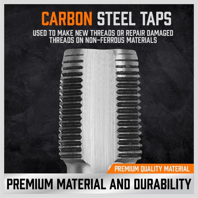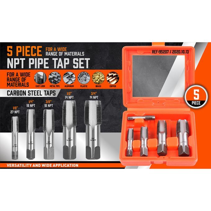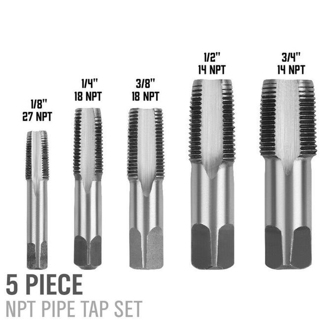 NPT Pipe taps sizes includes:1/8"- 27npt, 1/4"- 18npt, 3/8"- 18npt, 1/2"- 14npt, 3/4"- 14npt. Equipped with special storage box.