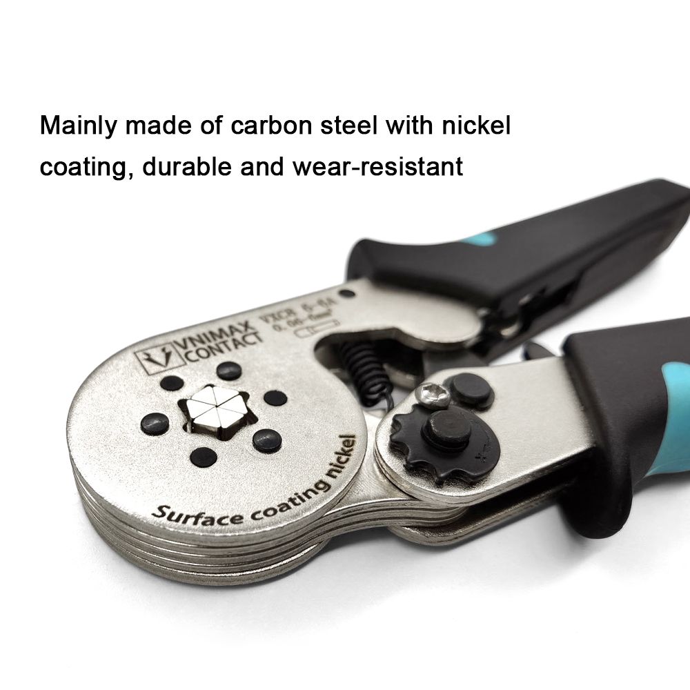 The crimping plier is mainly made of carbon steel with nickel coating, durable and wear-resistant.