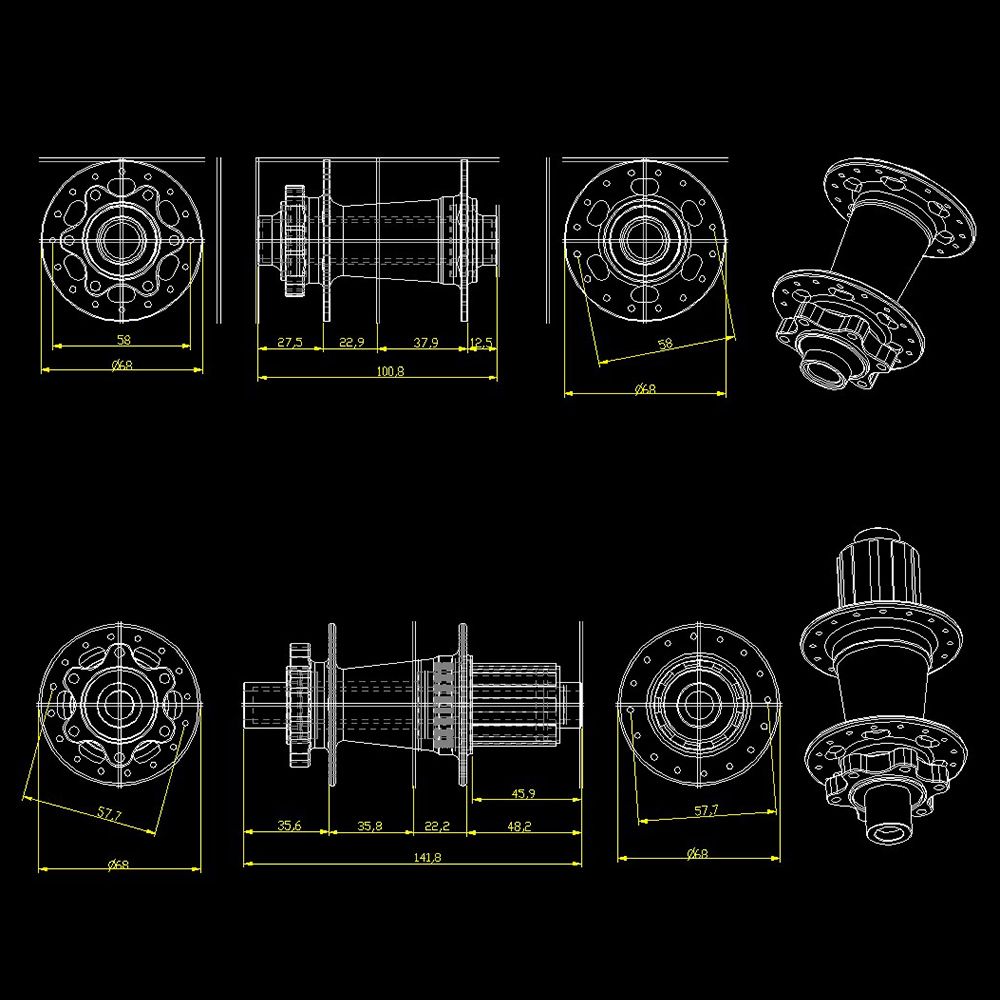 Front hub for 9x100mm / 15x100mm; Rear hub for 10x135mm / 12x142mm.