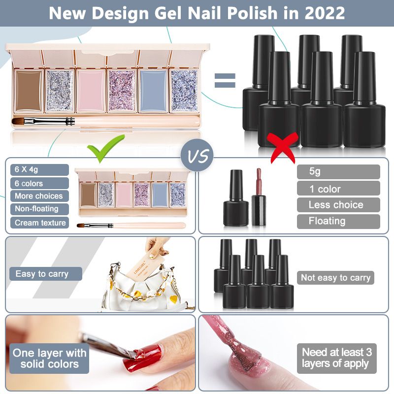 - 【Exclusive Innovative Solid Cream Nail Varnish】 Limegirl Exclusive Innovative 6 in 1 Solid Cream Varnish palette, 4g/0.14oz per color, with High-end professional nail bursh. Each color has an independent inner box to avoid mixing different colors.