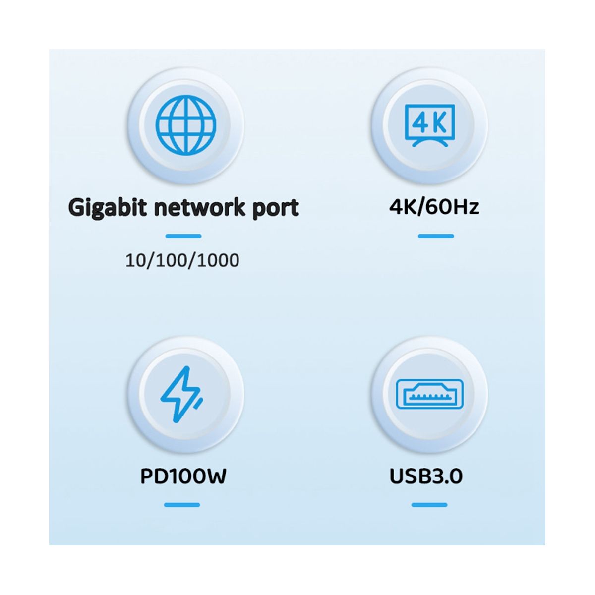 usb c docking station: with 4K@60Hz HDMI video output, 3 USB3.0 female ports, 1000Mbps Ethernet adapter and type-C PD charging, usb-c DATA interface.