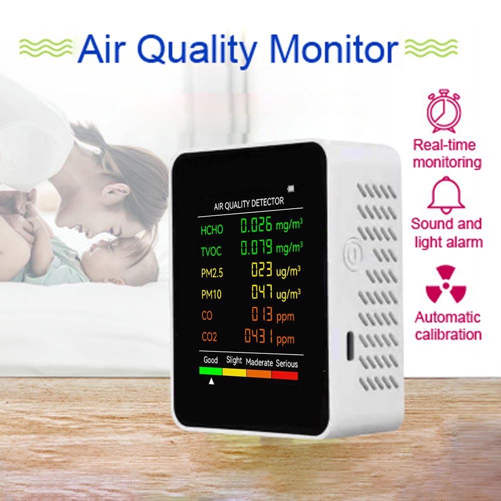 6 In 1 Air Quality Tester: Come and try this new type multifunctional air quality detector, compared with other air quality detectors, this detector can testing PM2.5, PM10, HCHO, TVOC, CO and CO2 for you at the same time.