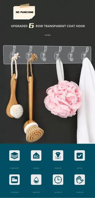 Packaging: 1 length of 6 in 1 Strong Self Adhesive Hanger. Our heavy duty adhesive transparent hooks to meet your needs in the living room, bathroom, kitchen, bedroom, garage or any other spaces, simple transparent invisible, clean and tidy, time can not change its color, long also durable. Our adhesive wall hooks make your home look clean and neat all the best, it add more joy and happiness of your life!