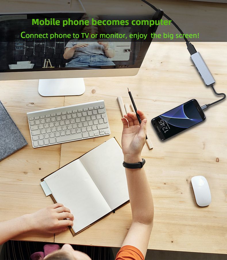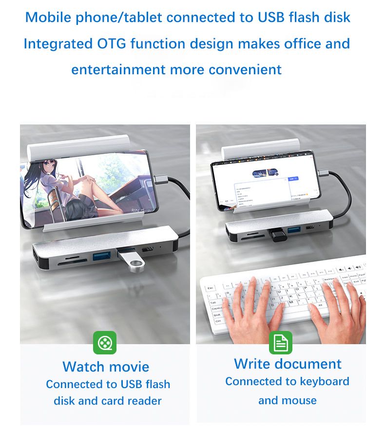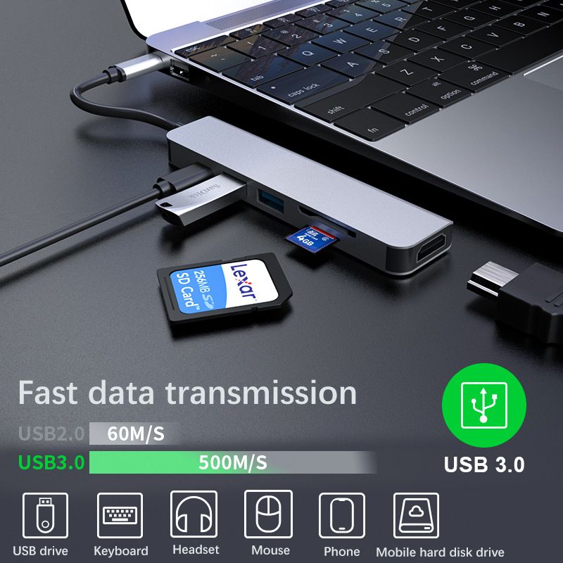 About this item:**6 in 1 Multiport USB C Hub**The intelligent USB C dock perfectly combine all functions you need.It extend one USB-C/Thunderbolt 3/ Type C port to 4K HDMI port*1, USB 3.0 port*1, USB 2.0 port*1, USB-C charging port*1, SD card slot*1 and TF card reader*1.Perfectly settle the problem of only one USB C port of your laptop.**4K@30Hz USB C to HDMI**Mirror or extend the display of your phone/laptop/tablet with usb-c hub HDMI port and directly stream 4K UHD @ 30Hz or full HD 1080P video to HDTV, monitor or projector. Enjoy movies with your family on big screens or make a vivid presentation in a meeting.**Super Speed USB 3.0 & SD/TF card reader**USB 3.0 port allow you to connect keyboard, Mouse, U disk, hard drive and etc to MacBook Pro, up to 5Gbps data transmission speed. No need wait for data transfer. Fast SD/TF Card Reader transfer data at speed up to 104MB/s, ideal for photographers and designers.**100W Power Delivery**Equiped with upgraded generation super smart chip, the type c charging port can pass up to 100w power to a USB-C powered device, and provide additional power for hard drives, DVD drives and accessories which connected to the USB port. No worry again about your device running out of power.**Solid build, Good Heat Dissipation**Aluminiun case design minimizes interference for stable signal and promotes better heat dissipation.Sturdy cords, solid casing,braided cable ensure this USB C adapter can last a long time.