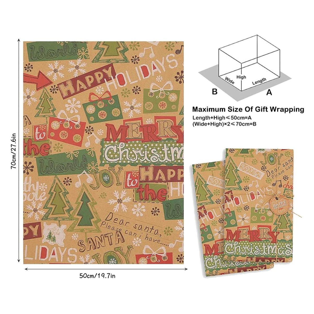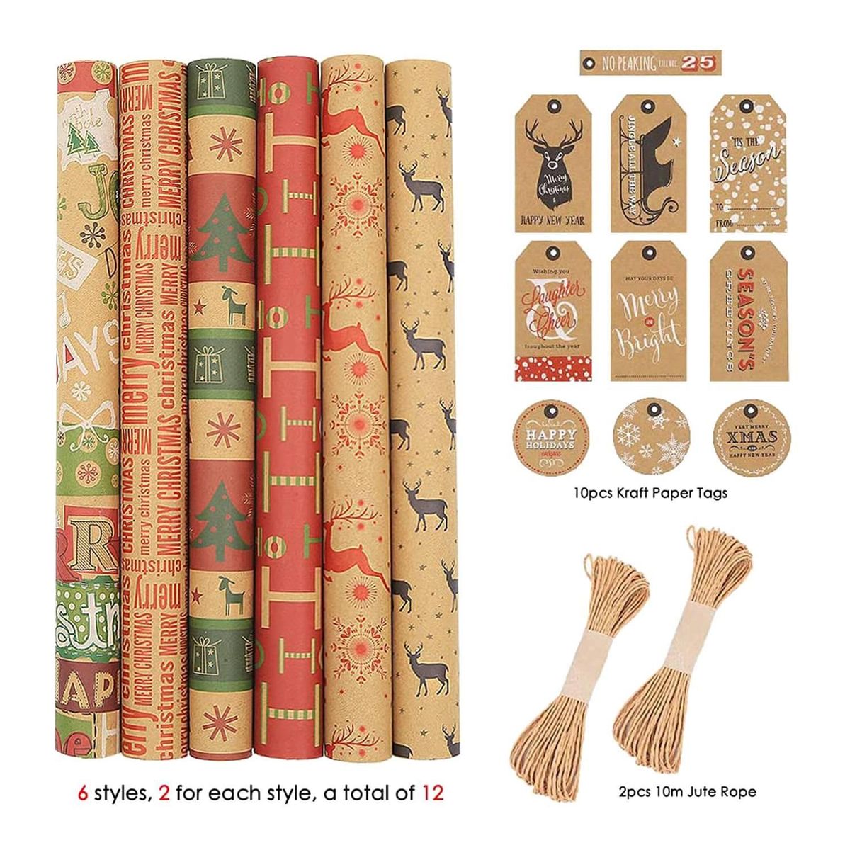 Detailed Information About The Product:Including 6 sheets, each sheet measures 50 x 70cm, 2 pack Jute Strings and 10pcs brown kraft Paper Tags and 1 roll tape. It is suitable for wrapping a lot of gifts. Giving you plenty of wrapping paper for that mountain of presents to go under the Christmas tree.
