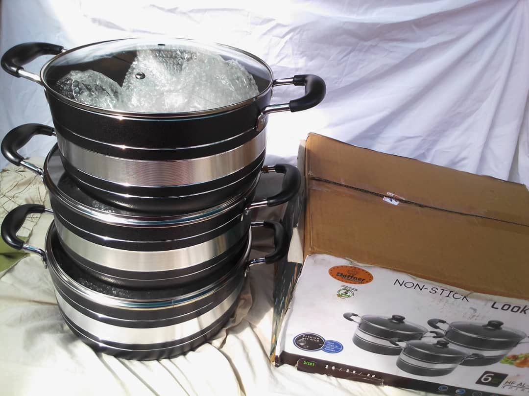 3 sets of non stick cooking pot and 3 PCs of lid.
