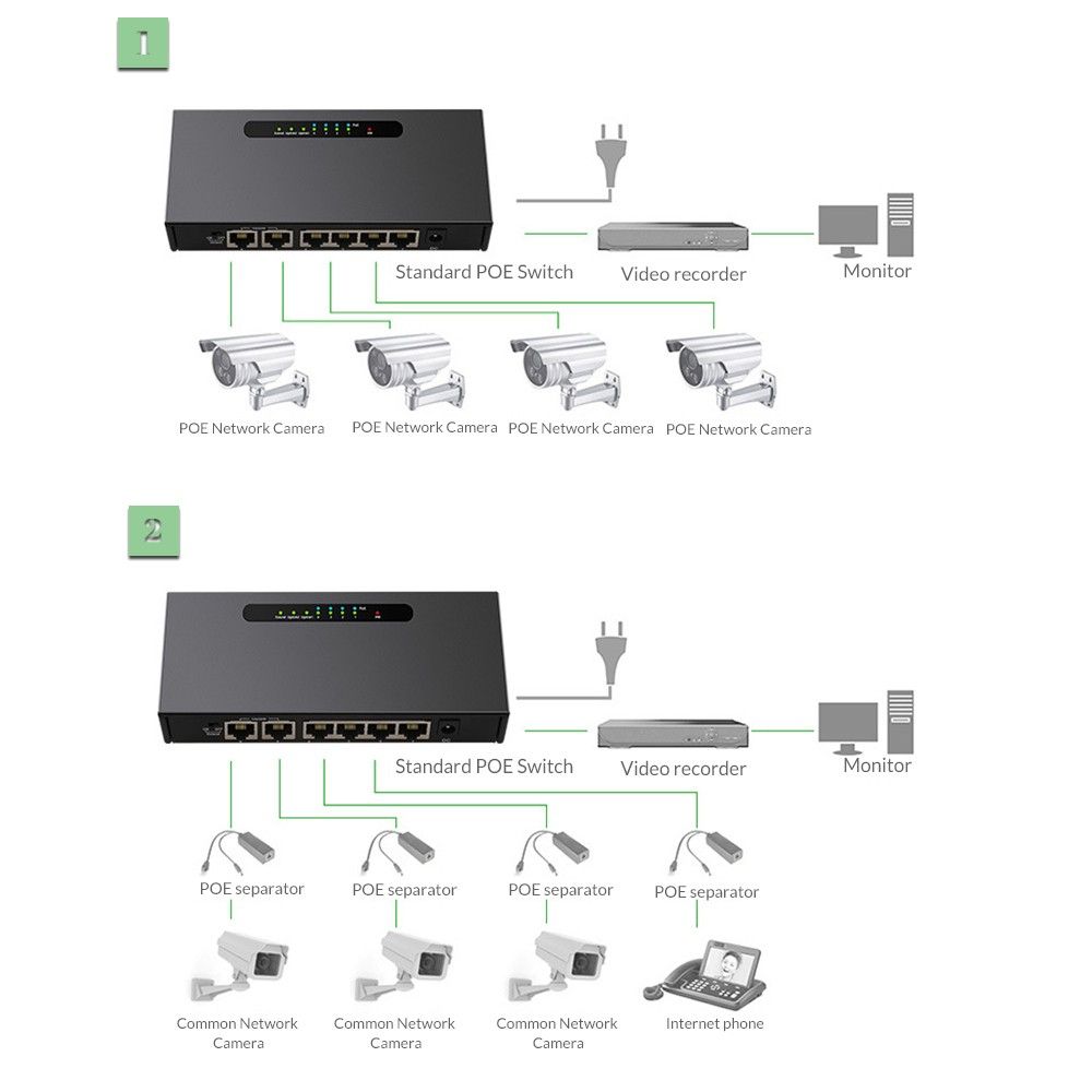 Built-in range enhancement mode, can achieve up to 250m transmission distance between POE switch and POE camera.(This mode only supports 1.3 and 2 megapixel cameras)