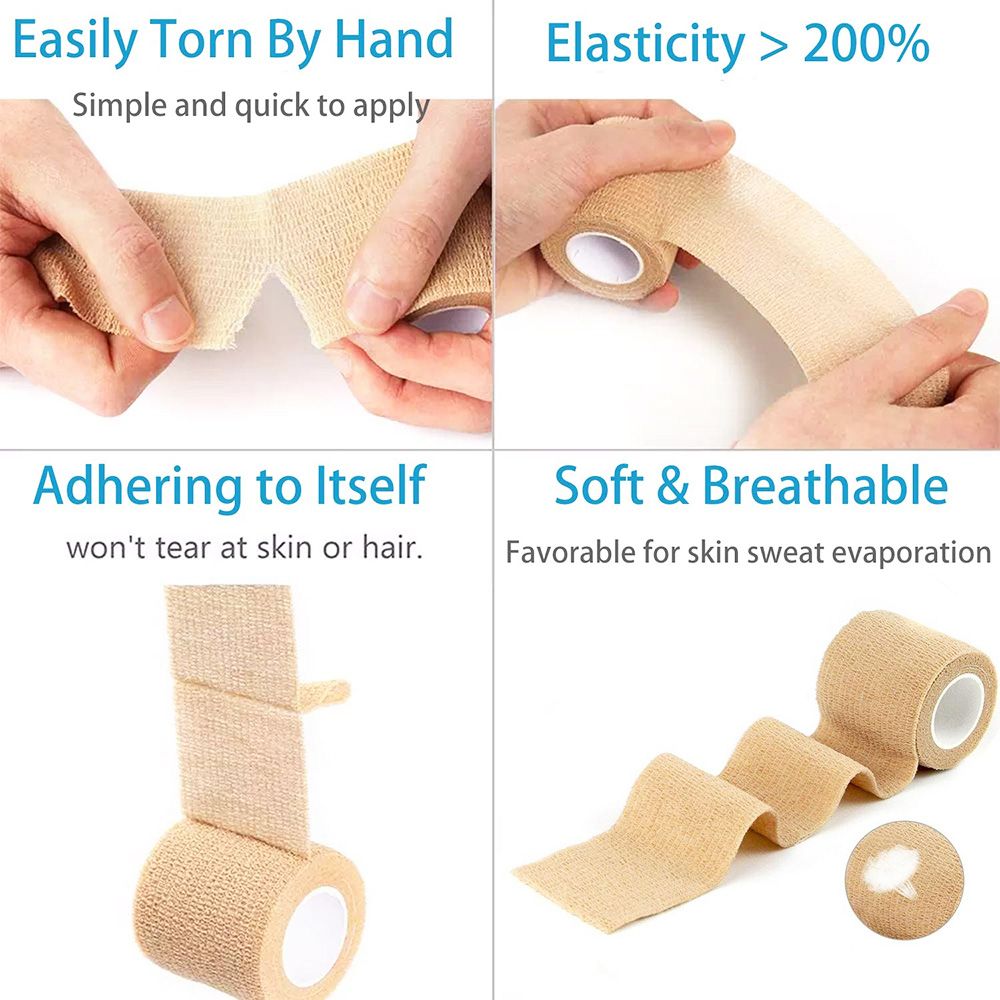 - Bandage is made of high quality non-woven and spandex material. The self-adhesive effect of these bandages is outstanding, they can be tightly attached and self-adhesive without tape. These self adherent bandages will not stick to the hair or on clothes, so they are easy to remove.