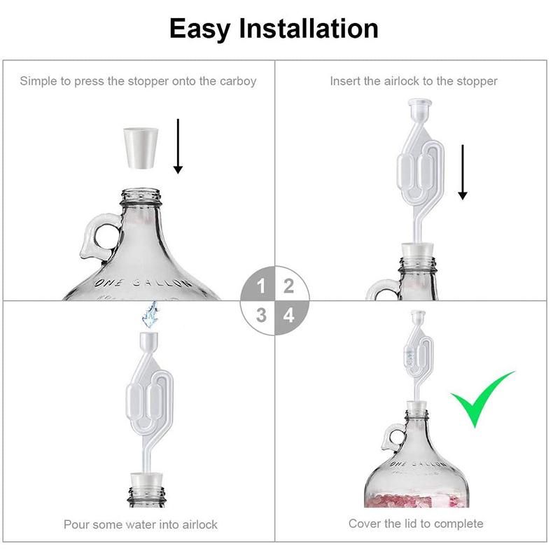 Simple to press the stopper onto the carboy, insert the beer airlock to the stopper, pour some water into airlock and cover the lid to complete all operations.