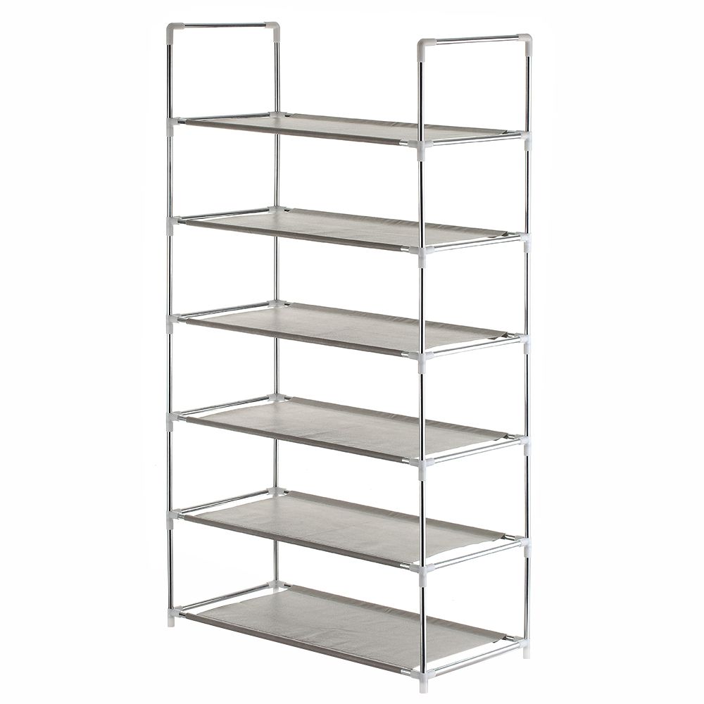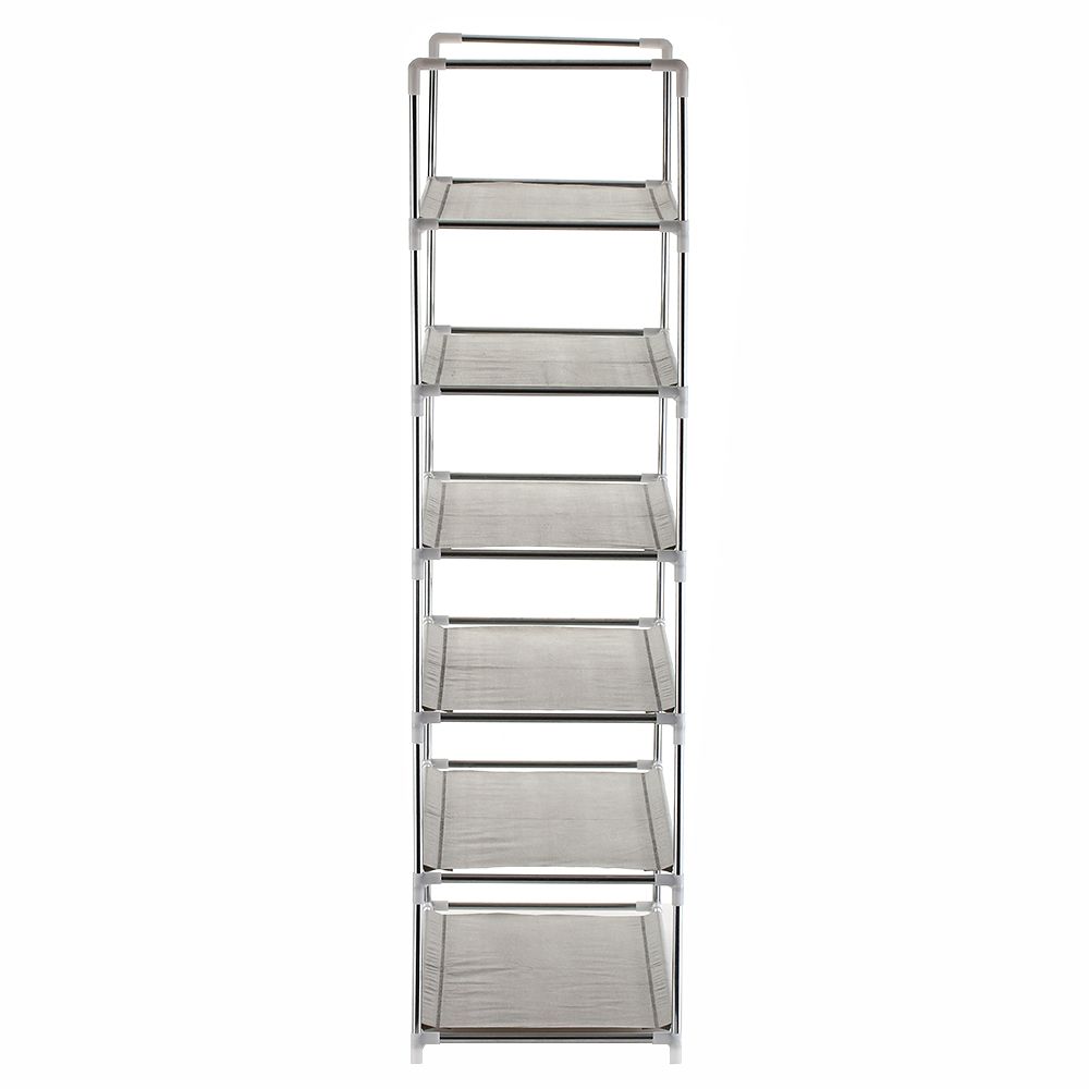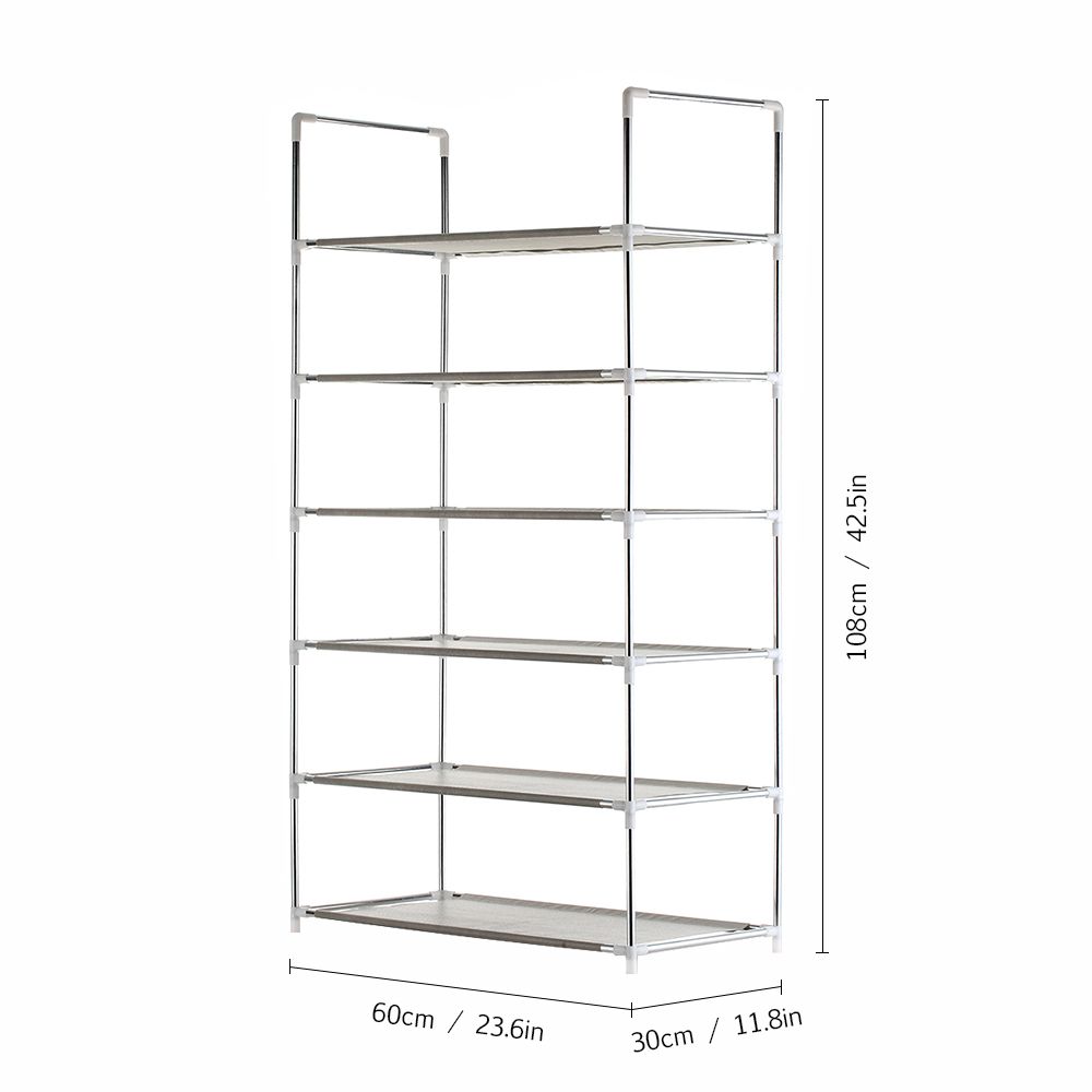 Keep your shoes organized with this Shoe Rack, which is designed to provide a great storage solution for your collection of favorite footwear. It is constructed out of durable iron pipes, non-woven fabric and plastic connectors. Each shelf holds up to 3 pairs of full-size shoes. This is a decent rack to store your shoes and fits well into you doorway, entryway, bedroom, closet and so on. This space-saving shoe rack could also be put in a corner or in a hall.