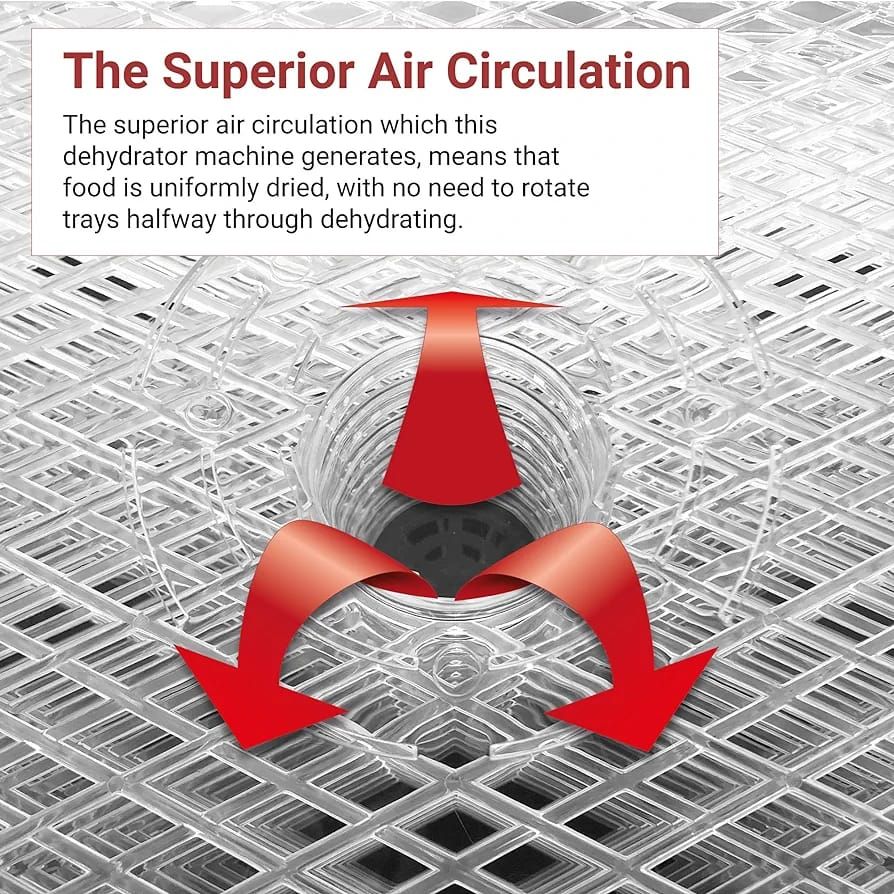 The superior air circulation this machine generates means food is uniformly dried, with no need to rotate trays halfway through dehydrating. The adjustable digital thermostat of 40-70°C lets different foods dry at correct temperatures, the adjustable digital timer lets you program the dehydrator for up to 48 hours