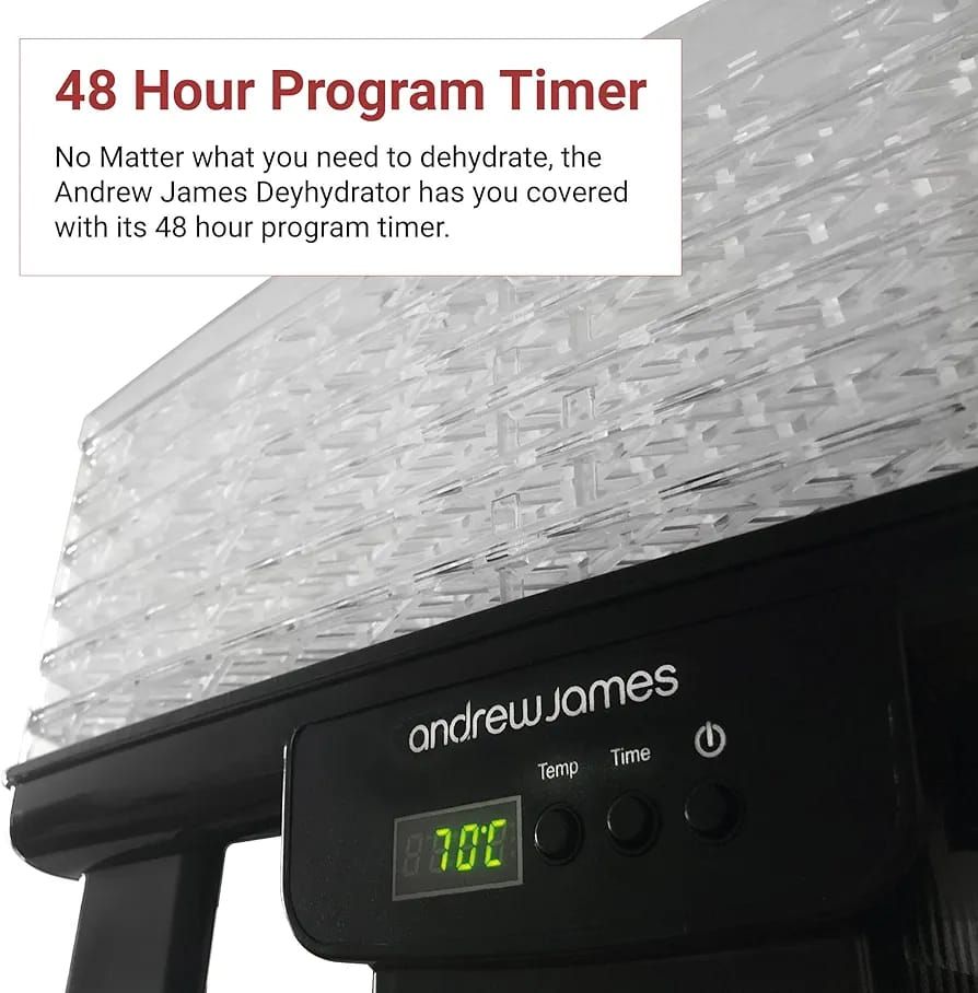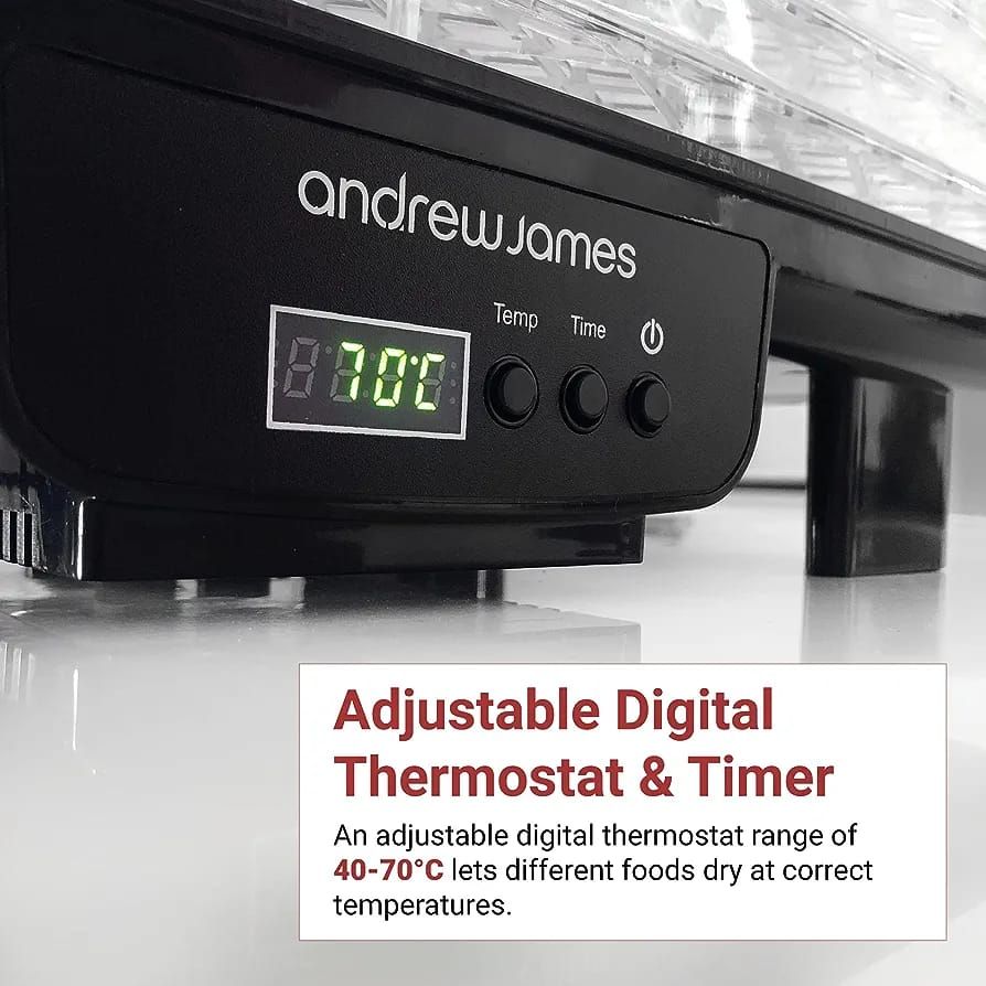 Brand: Andrew jamesMaterial: PlasticColour: BlackWattage: 550 wattsItem dimensions L x W x H: 44 x 29 x 21 centimetresVoltage: 230 Volts6 STACKABLE TRAYS -- The Andrew James Digital Food Dehydrator includes 6 spacious drying layers meaning there is enough capacity to hold large quantities of food easily. The variable tray stacking system lets you stack the layers at different heights, allowing the dehydrator to accommodate food of different size and thickness.ADJUSTABLE DIGITAL THERMOSTAT & TIMER -- An adjustable digital thermostat range of 40-70 degrees C lets different foods dry at correct temperatures. The superior air circulation which this dehydrator machine generates, means that food is uniformly dried, with no need to rotate trays halfway through dehydrating. The adjustable digital timer lets you program the dehydrator for up to 48 hourLOW ENERGY USAGE & EASY TO CLEAN -- Using a dehydrator machine is a low energy consumption alternate for healthy snacks, operating at just 3p per hour for up to 48 hours. Some dehydrator users prefer to use dehydrator sheets but with our model it features the stackable trays which