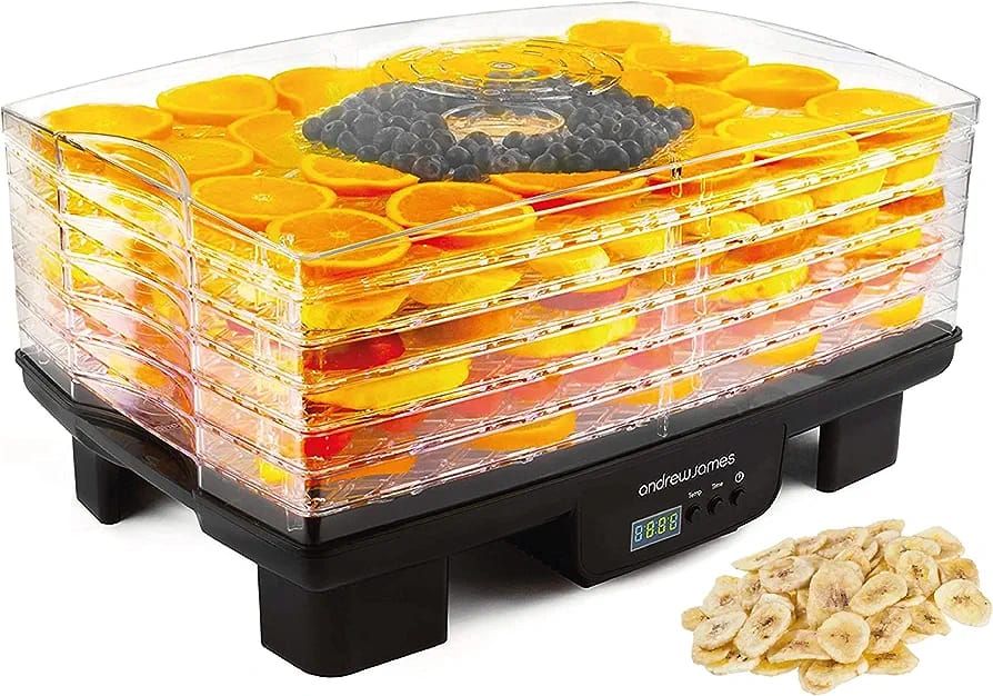 Andrew James DehydratorIncludes 6 TraysThe Digital Food Dehydrator is a fast and easy way to make delicious healthy, natural snacks like banana chips, fruit roll-ups, beef jerky. Using a dehydration machine allows the food to retain the full flavour and nutrients.
