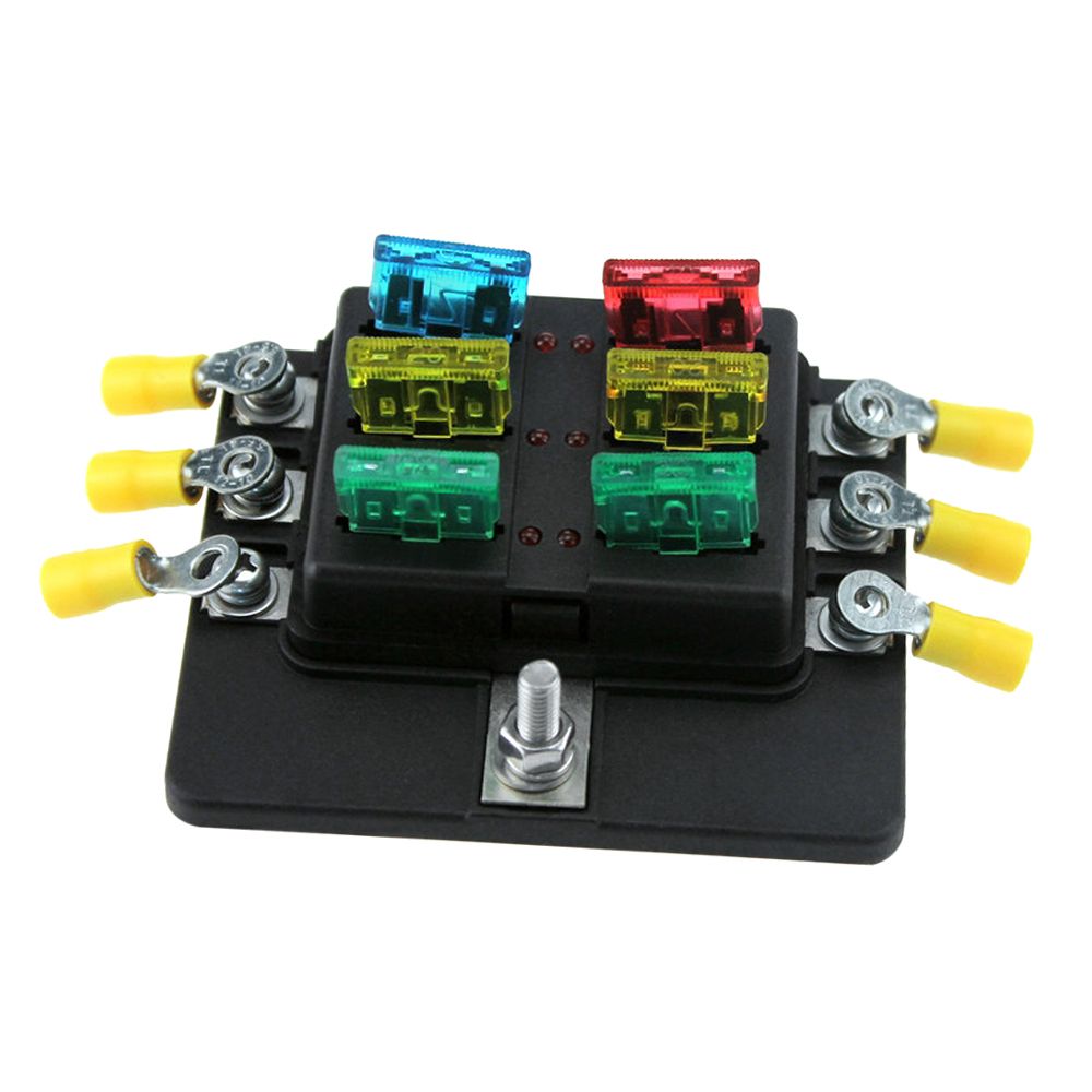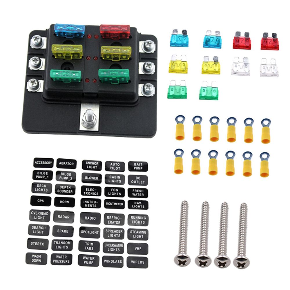 6 Way Blade Fuse Box with LED Indicator + 10Pcs Fuses + 10Pcs Terminals + 1Pcs decal