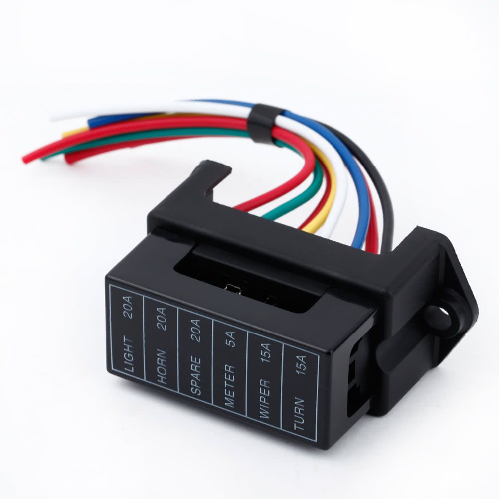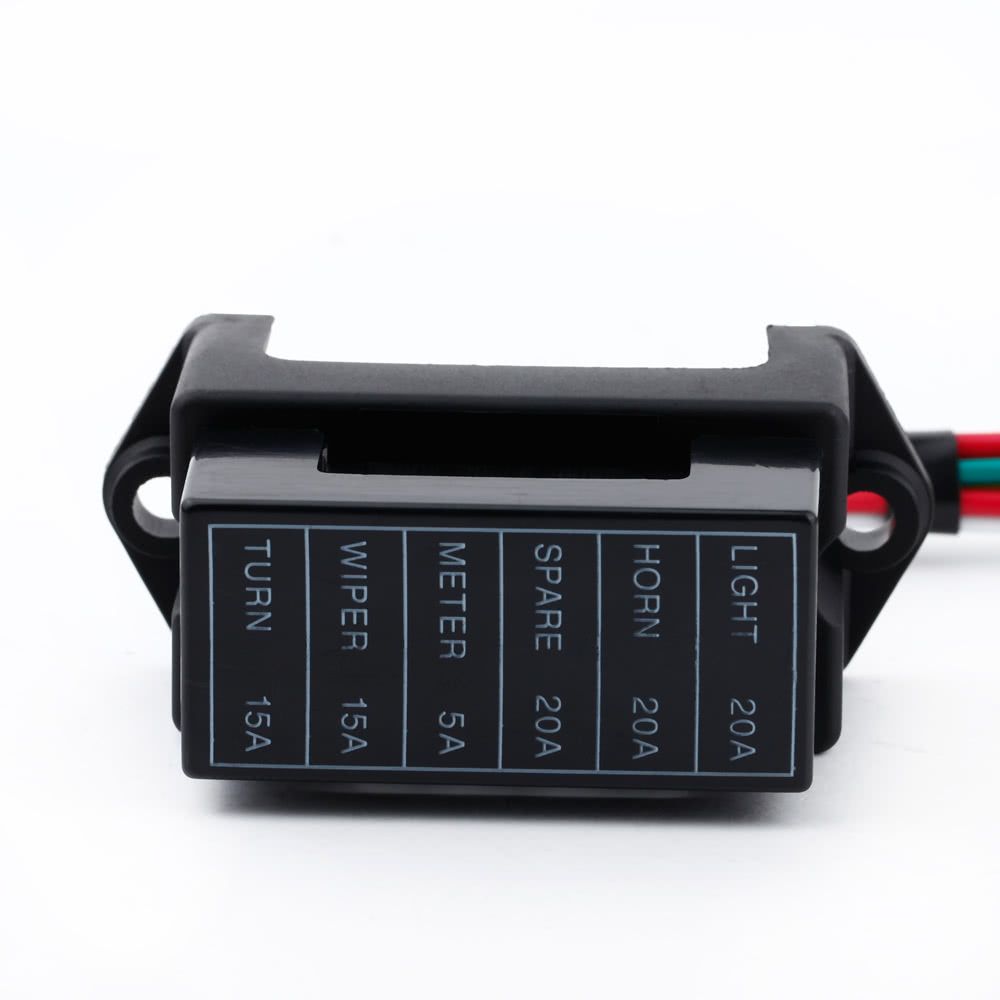 This 6-way fuse box in sturdy construction can be used in automotive electronic field, motorsport applications, electrical devices, trailers, cars, boats, etc. It comes with 8 wires (two input wires and 6 output wires).