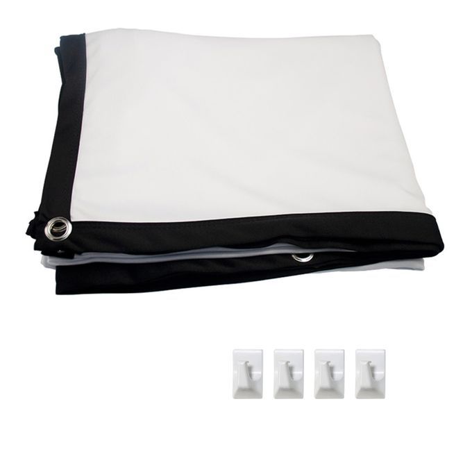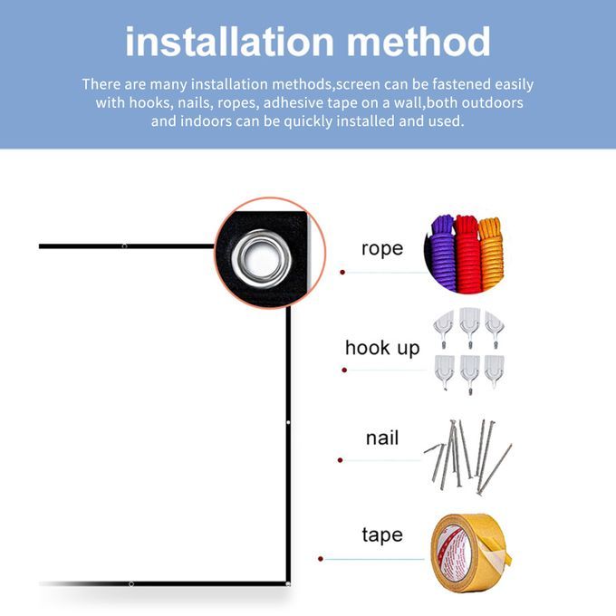 Quick and Easy Installation : Projector screen with black reinforced edges and metal holes, screen can be fastened easily with hooks, nails, ropes, adhesive tape on a wall. Comes with hooks for easy hanging.