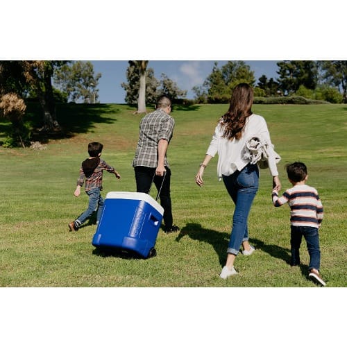 Time to haul snacks for your friends to the concert in the park or juice boxes for the baseball team.Rest easy with the Igloo 60-Quart Laguna Roller Cooler in Majestic Blue.The Cool Riser Technology will keep your drinks and snacks cold for hours while the two self-draining drink holderskeep your beverages within arm & rsquo;s reach. With the locking, telescoping handle, you can push or pull your newIgloo Laguna Roller Cooler to your next adventure! Igloo 60-Quart Laguna Roller Cooler with Wheels - Red