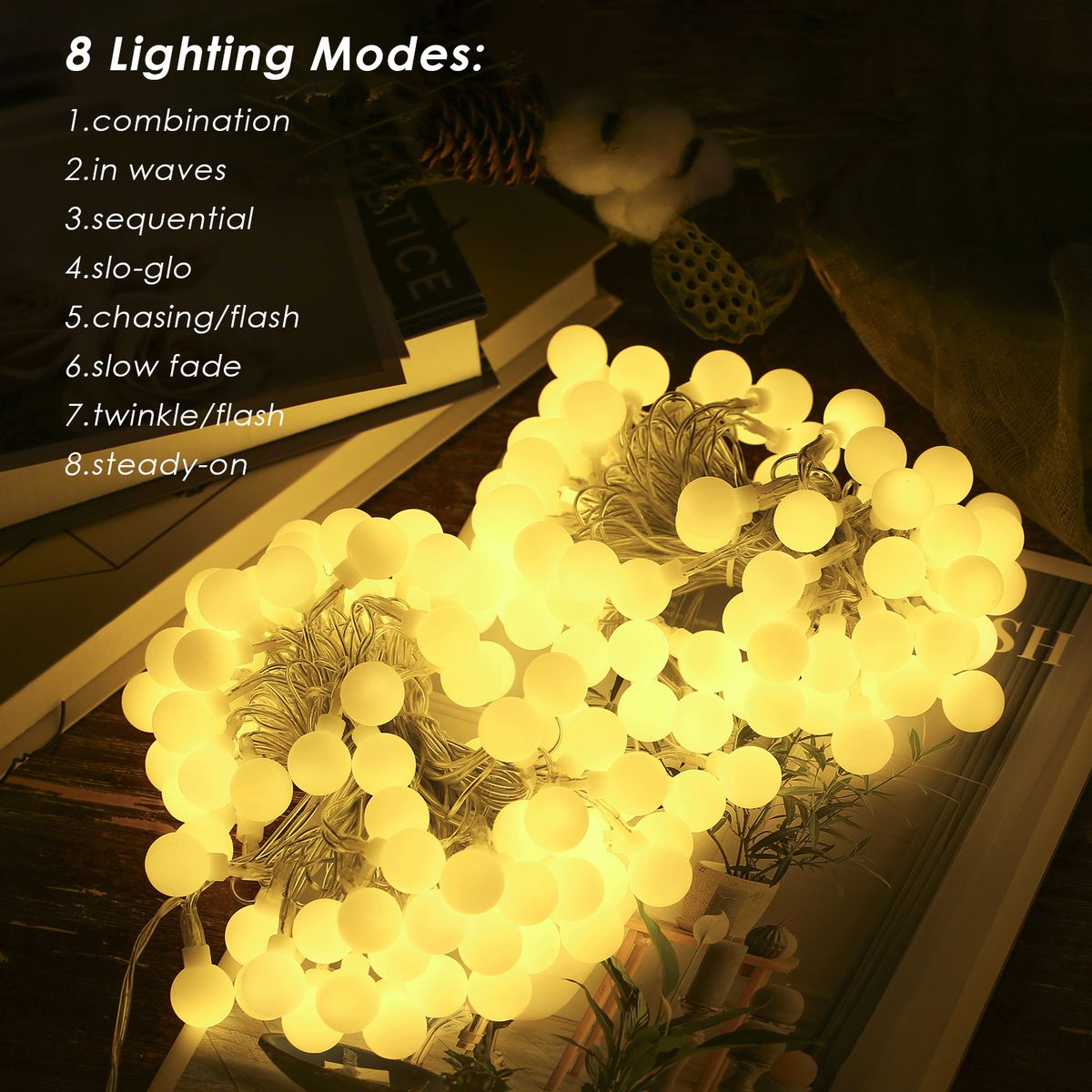 The controller has 8 different lighting modes combination: in waves, sequential, slogs lo, chasing/flash, slow fade, twinkle/flash, and steady on.
