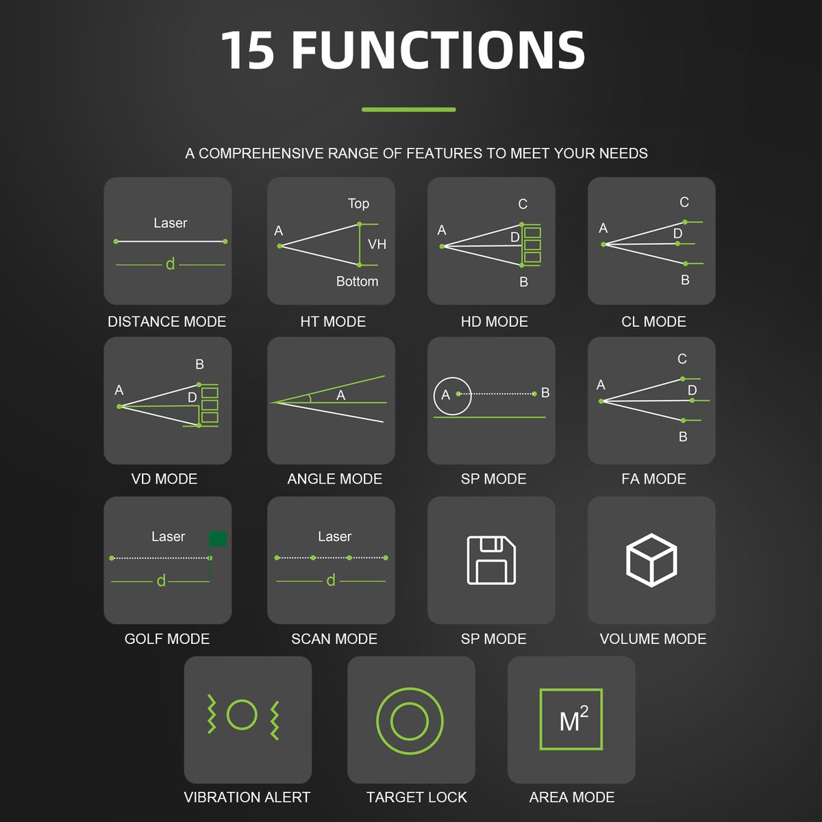 Multiple functions with Straight line distance, Vertical distance, Horizontal distance, Speed, Two-point height, Closest/Farthest distance, Area, Volume, Golf distance compensation, 20 sets of data storage, and more.