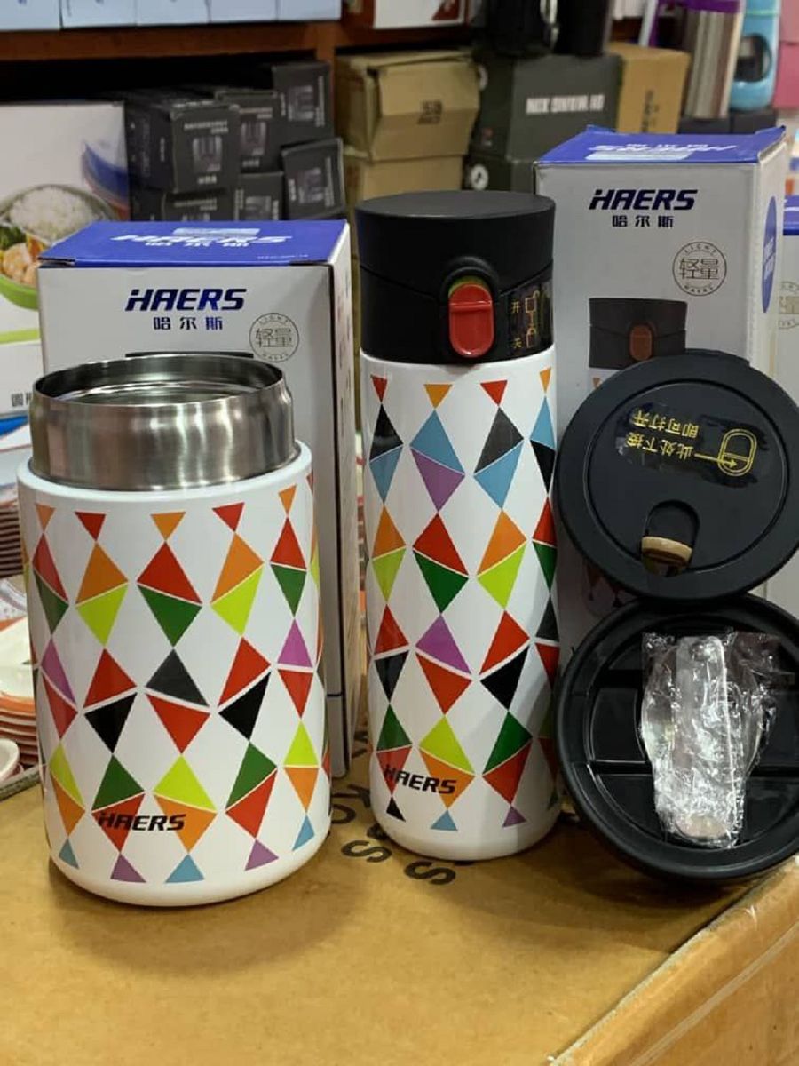 The lunch box is made of food- grade stainless steel and PP, which is and safe to use. Good leak- proof performance and handle, convenient to carry. Large- capacity effective preservation function, very practical.600ml Haers food flask & 350ml HAERS water flask set