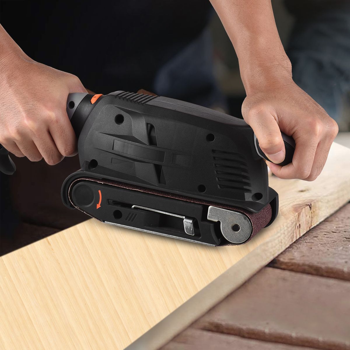 Efficient Belt Sander -- Adopting high-performance copper motor, this electric sander with variable speed (360-560rpm no load speed) and 600W high power is great for wood polishing.
