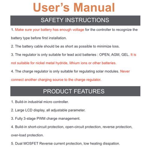 3. The regulator is ONLY suitable for lead acid batteries: OPEN, AGM. (NOT suitable for nickel metal hydride, lithium ions or other batteries)