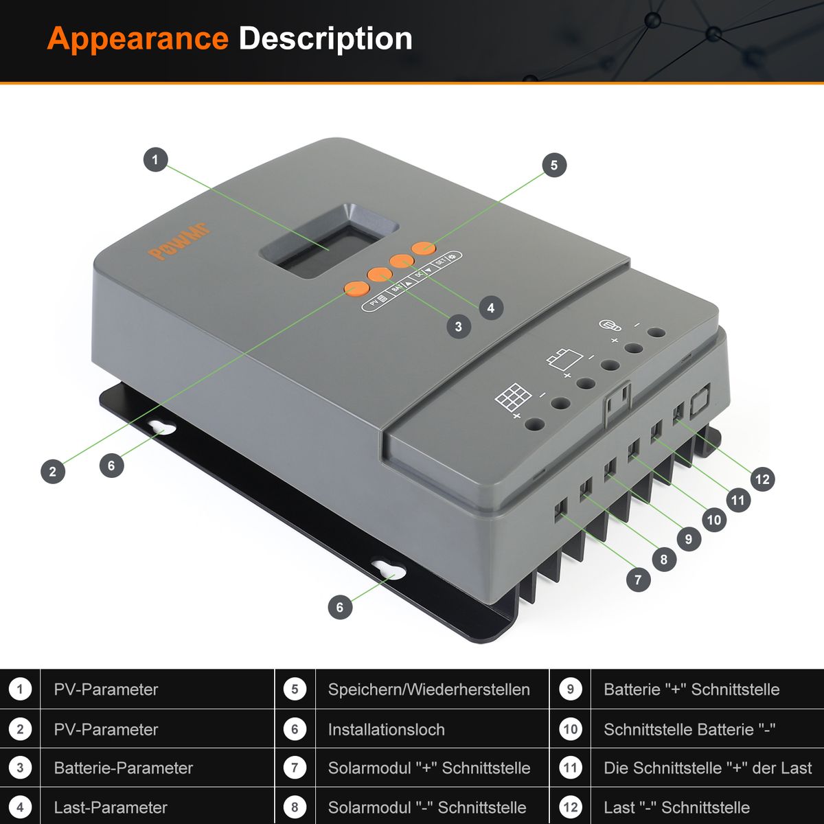 - 3.Blacklight LCD display PV voltage / output power / battery voltage / charging current / working mode / temperature, TROUBLESHOOTING function and LCD display and can help users not only to check the data and operating states of the complete system, but also to quickly identify system failures and modify parameters.