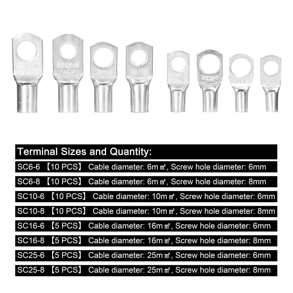 Terminal Sizes and Quantity:SC6-6 【10 PCS】 Cable diameter: 6m㎡, Screw hole diameter: 6mm