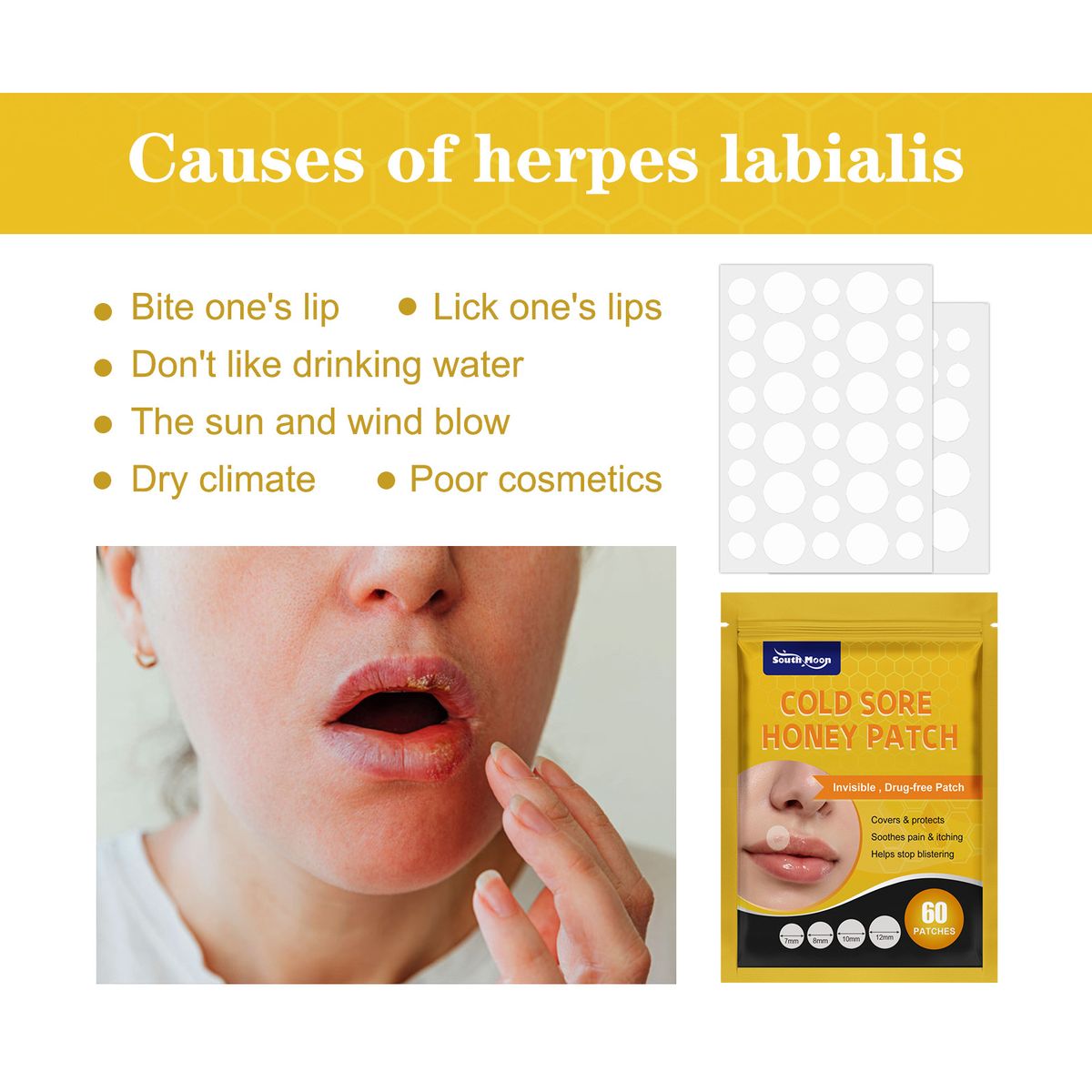 Not only protects your cold sores from worsening, stop the impulse to touch the area, but also effectively relieve itching pain, reduce the blistering and prevent scabbing.