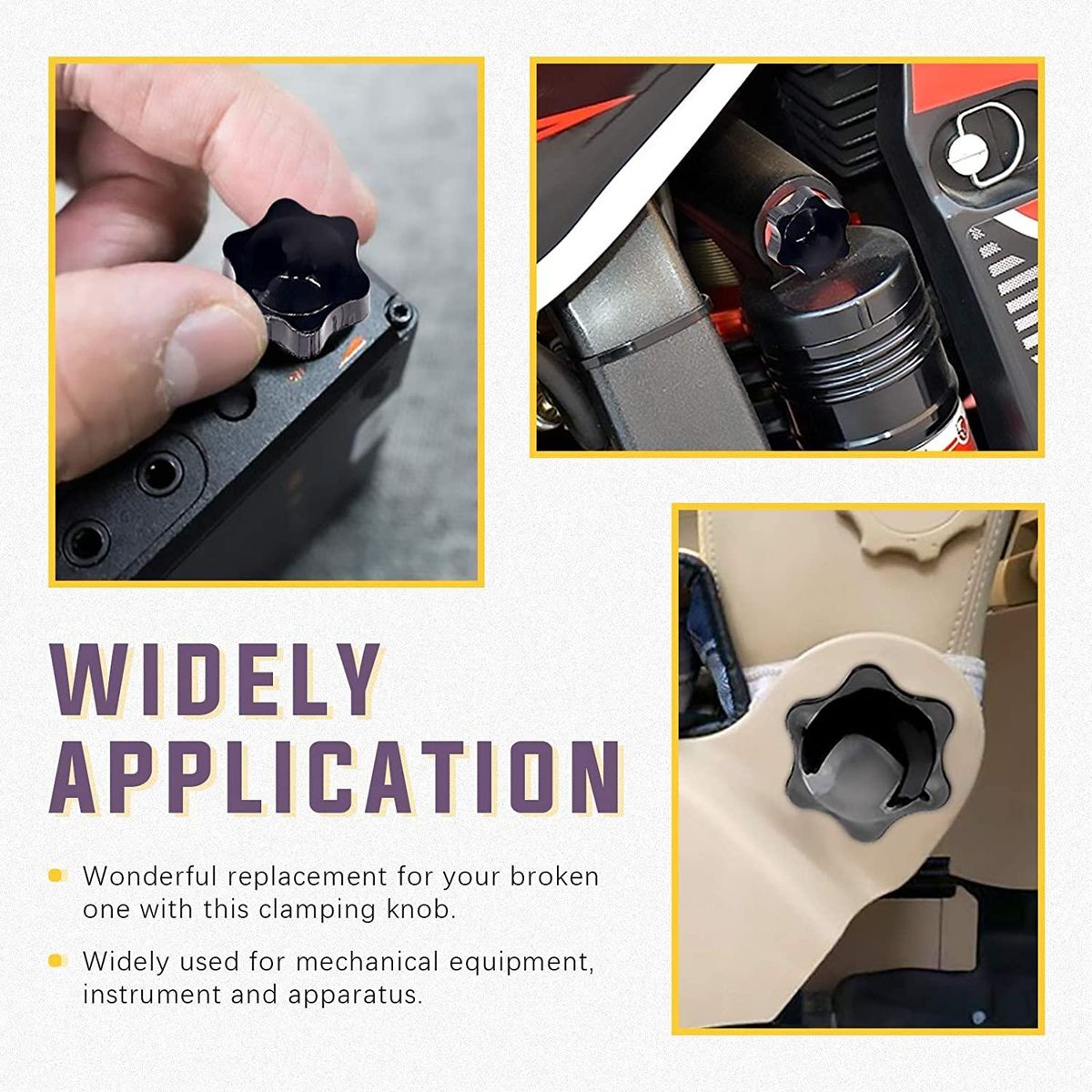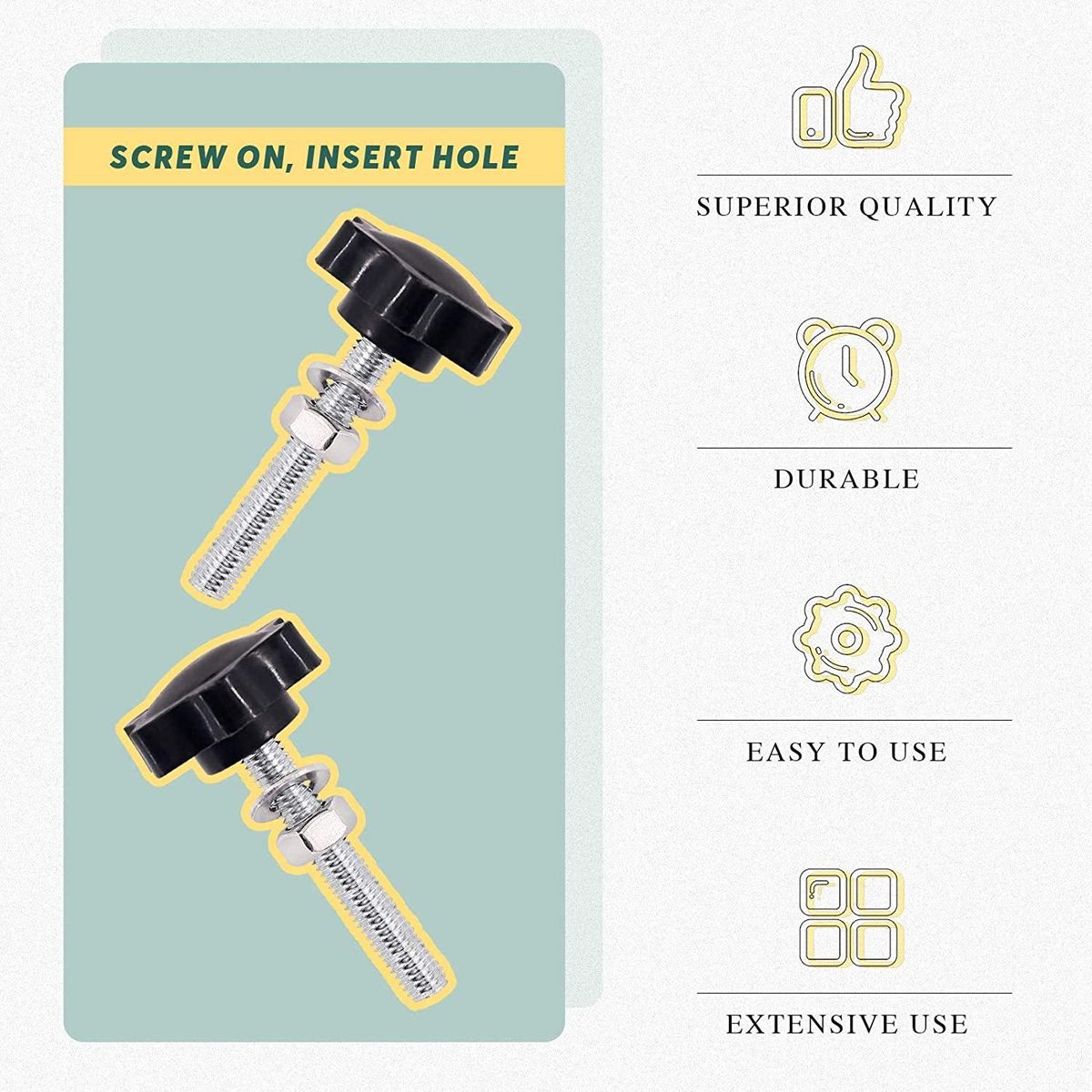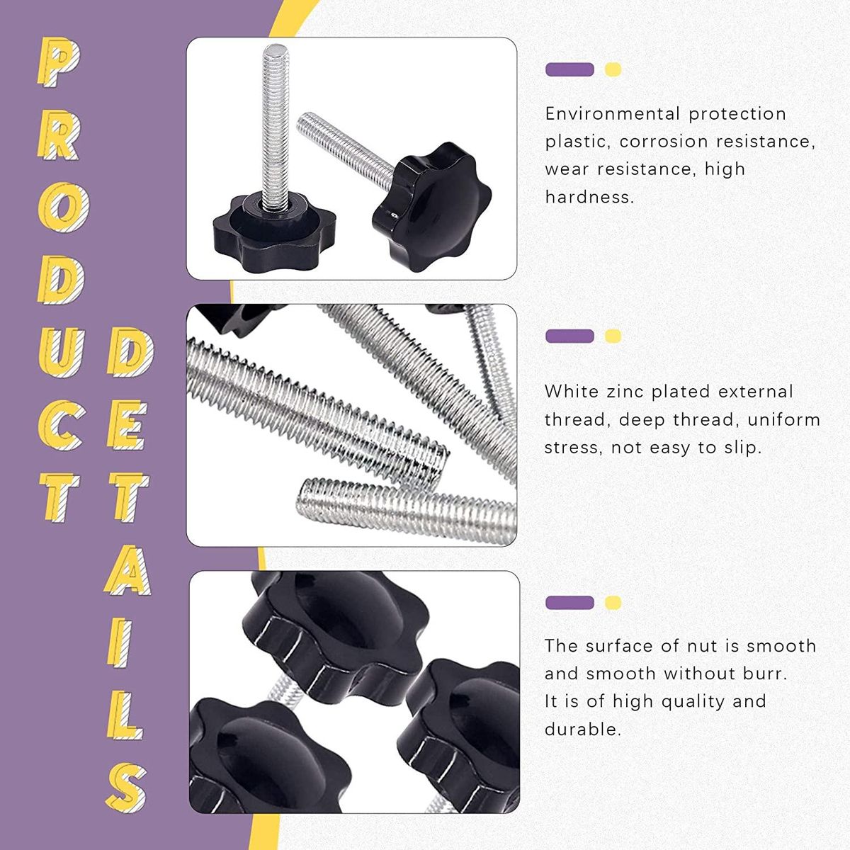 [Wide Application]------- The head is made of plastic, good toughness, strong anti-aging , zinc plating on the surface of the screw, corrosion resistance. This Plastic Hand Knob Screw is easy to install and remove and does not require any tools.Widely used in furniture decoration, electronic equipment, mechanical equipment and other related industries. Colour:black