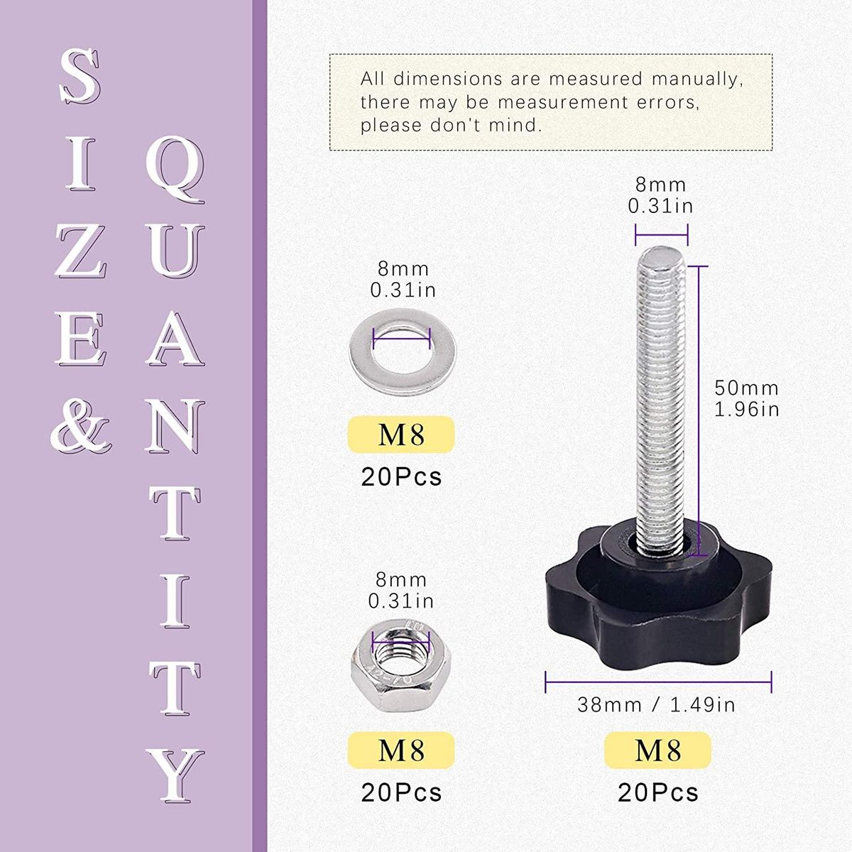 [ Thread Size]------- M8 x 30mm/ 0.30 x 1.5inch(DxL), M6 x 20mm/ 0.23 x 0.8inch(DxL), x 12mm/ 0.15 x 0.47inch(DxL); M8 Head Dia (): 38mm / 1.47inch, M6 Screw Knob Head Dia (): 32mm / 1.26inch, Screw Knob Head Dia (): 25mm / 0.98inch.