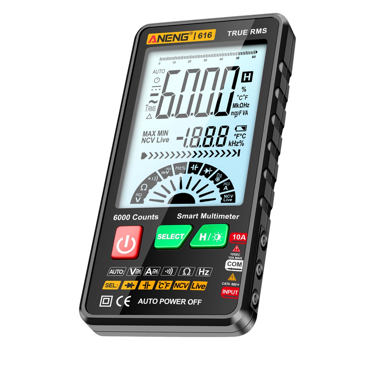 This is a battery-powered, auto-ranging, true RMS digital multimeter with a 6000 counts LCD display.