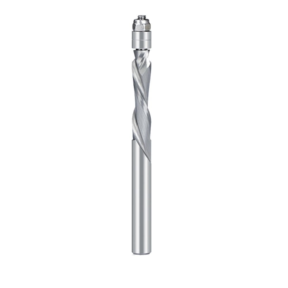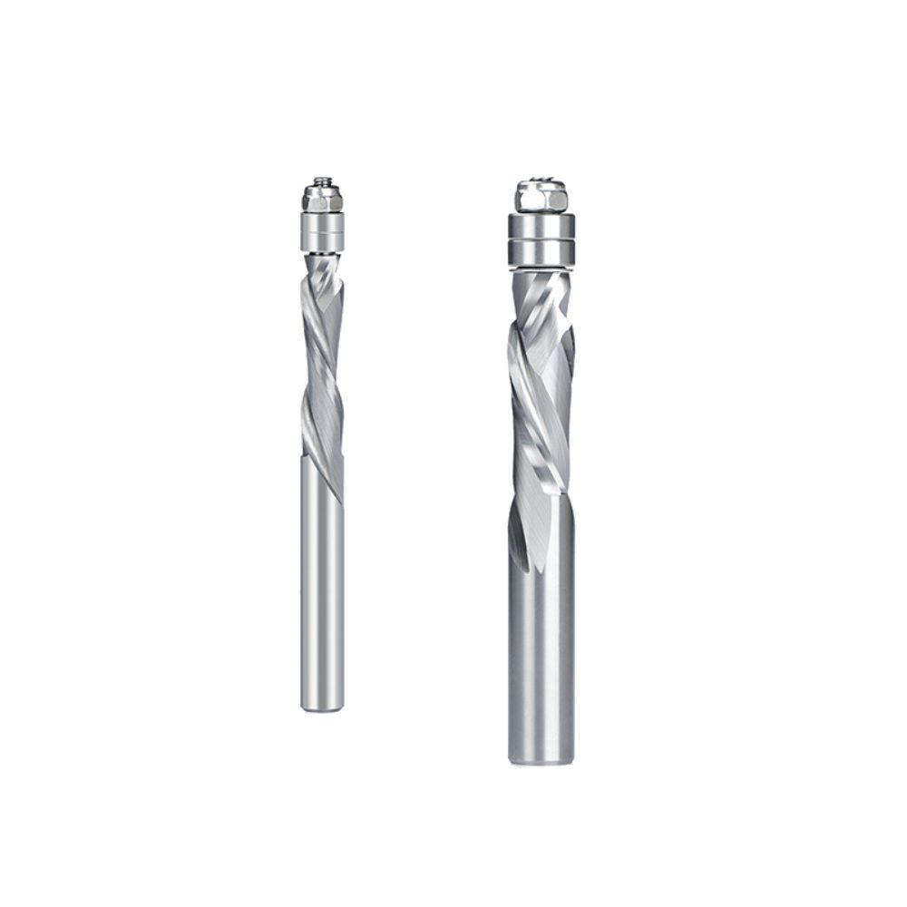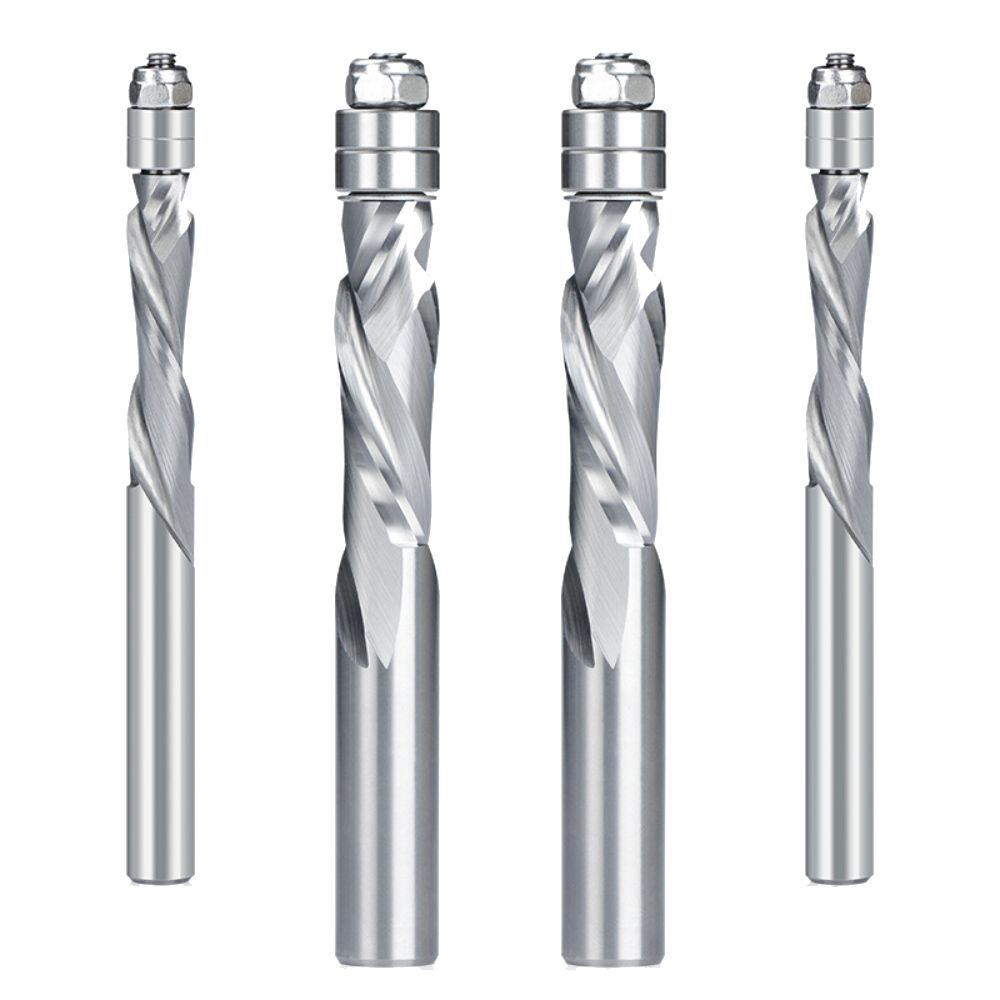 2. Spiral flush trim router bits work just like regular flush trim bits, but the spiral cutter reduces chipping.