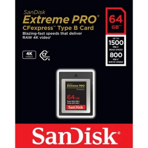 Designed to deliver speeds necessary for working with smooth, raw 4K video captures at resolutions up to 4096 x 2160, the 64GB Extreme PRO CFexpress Card Type B from SanDisk provides read speeds of up to 1500 MB/s and write speeds of up to 800 MB/s, which enables low latency during high-speed recording and an enhanced workflow efficiency. This card is also backward compatible with select XQD cameras that adopt firmware to enable CFexpress. In the event of accidental file deletion, SanDisk's RescuePRO Deluxe data recover software is available as a free download.Please check with the manufacturer of your particular camera to ensure CFexpress compatibility.General FeaturesSpeeds That Surpass Other CardsHigh-speed, consistent recording and an enhanced workflow efficiency beyond existing SanDisk cards are the result of read speeds of up to 1500 MB/s and write speeds of up to 800 MB/s.Smooth 4K Video PerformanceThe CFexpress form factor captures raw 4K video with sustainable, low-latency performance in your video recording.XQD CompatibilityThe card is backward compatible with select XQD cameras that adopt firmware enabling CFexpress. The CFexpress Card Type B bridges existing devices with the future of technology.File Recovery with RescuePRO Deluxe SoftwareThe card comes with a RescuePRO Deluxe data recovery software download offer. This software makes it easy to recover files that have been accidentally deleted.