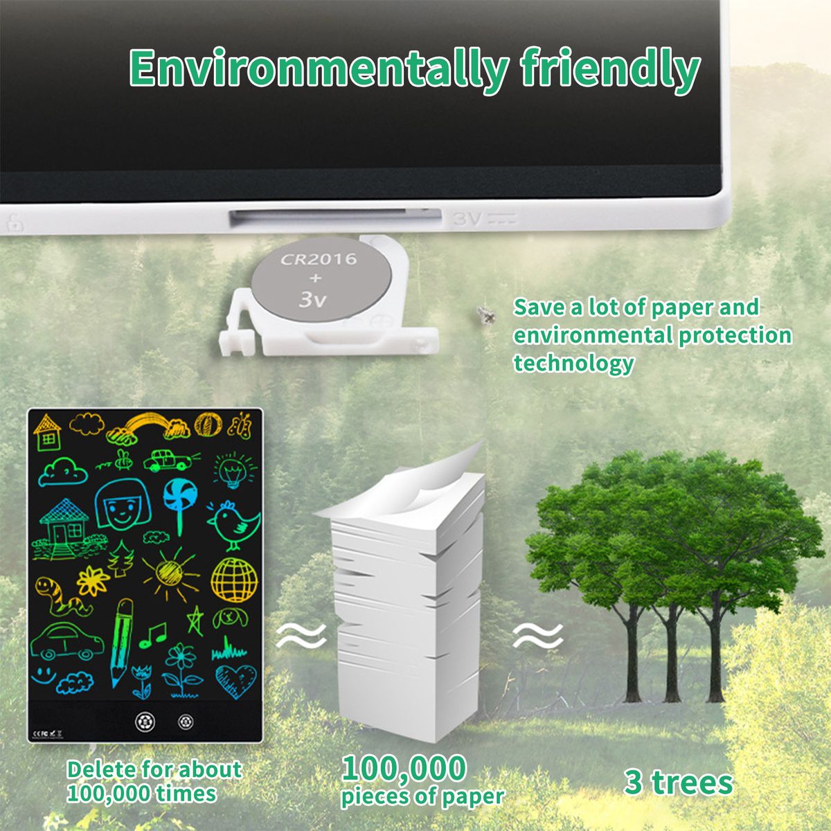 Environmentally friendly: Paper free,the LCD writing tablet can be used for about 100,000 times writing and deleting,equivalent to 100,000+ sheets of A4 paper,which can avoid the waste of paper and pencils.The colorful screen of painting board can provide a better painting experience,no blue light and glare,avoiding injury to child\'s eyes from long-term use.