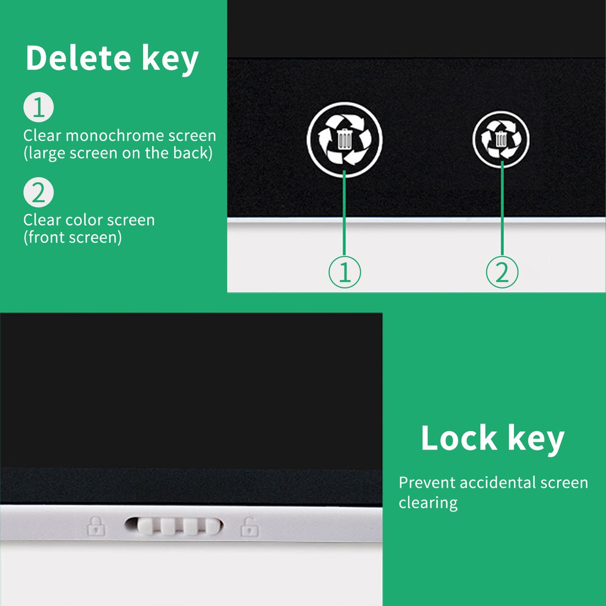 Easy to Use: Depending on how hard you use the stylus,LCD writing tablet will create lines of different thicknesses.You can draw lines on the LCD writing tablet with a stylus pen or nails.Press the delete button, everything will be deleted, the edge of the screen has a lock button design to avoid accidental deletion.
