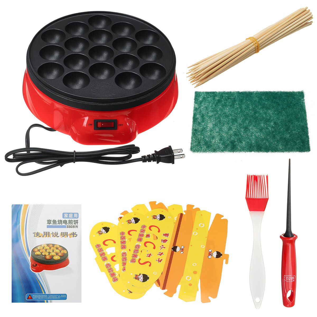 1 x Takoyaki Grill Pan 1 x Brush 2 x Iron Sticks 30 x Bamboo Sticks 1 x Cleaning Cloth 3 x Paper Box