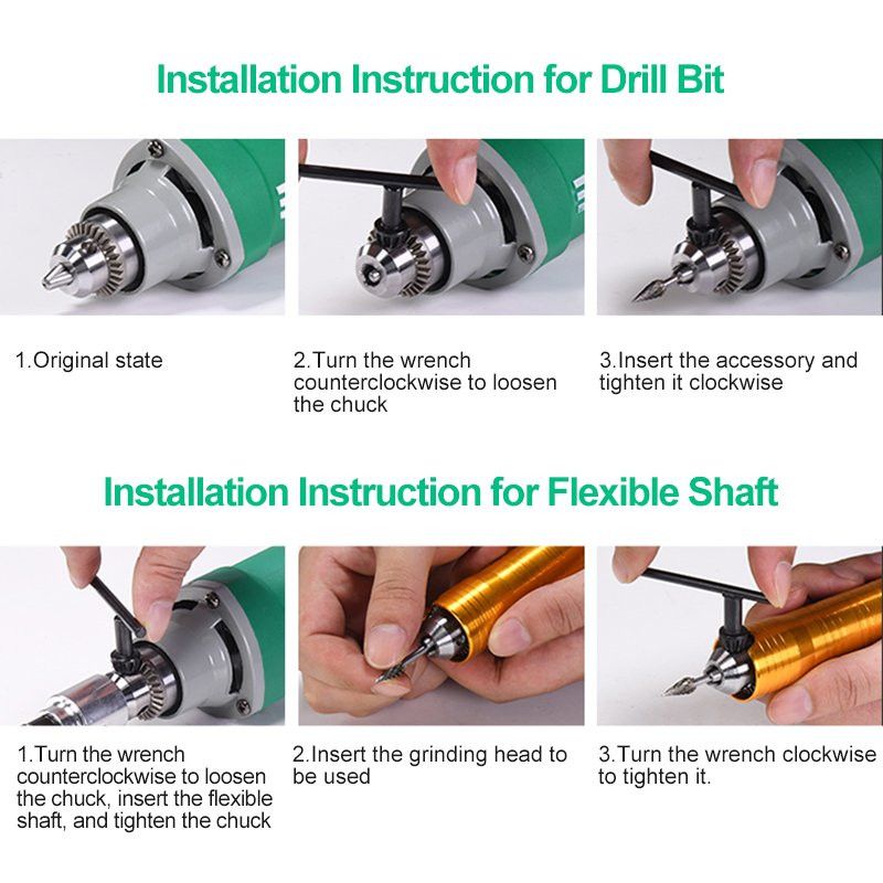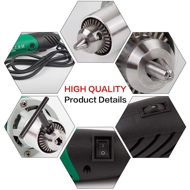 Features: 6.5mm Fine Steel Chuck. High-precision drill chuck of 0.3-6.5mm is adopted. All drill bits in the range of 0.3-6.5mm can be used. 6-level Adjustable Speed. Suitable for all kinds of operation requirements with accurate adjustment of output power speed. Has powerful speed of 35000RPM,strong power guarantees grinding speed and efficiency. Built-in Power Switch. Prevent accidental pre, and the design of every part is refined. Fast Heat Diipation and Durable to Use. Our angle grinder adopts ral air suction effect, quickly achieving heat diipation function, so as to make the motor more durable. Convenient to Replace the Carbon Brush. Even people who don't understand the structure of the tool can easily replace the carbon brush. Comfortable to Hold with Light Body. In order to make it more convenient for users to use, we have done a lot of tests and user experience feedback on the comfort of grip angle, which is suitable for 95% of the population and can be more convenient for operation. Thickened and Lengthened Power Cable. In order to adapt to high-load work, lengthen and thicken the power cable, which has good corrosion resistance. High-power Copper Motor. Strong power, anti-overload, not easy to burn. High-efficiency Cooling Window. 12-blade metal fan, multi-channel heat diipation. Wide Application: Stone carving, wood carving, metal polishing, metal derusting, punching, cutting. Compatible Grinding Head: Double-mesh Cutting Disc, Sandpaper Ring Grinding Head, Wire Brush Grinding Head, Emery Cutting Disc, Alloy Bit, etc. Specification: Name: Chuck electric grinder Rated voltage: 220V Rated power: 500W Rated frequency: 50Hz Speed: 35000r/min Chuck: 6.5mm Overall length: 250mm Plug type: UK,EU,US,AU Color: as show Packing Included: 1 * Chuck Electric Grinder Note: 1. Please allow 1-3cm (0.4-1.18") difference due to manual measurement and slight for different display setting. 2. Due to the light and screen difference, the item's color may be slightly different from the pictures. Please understand.