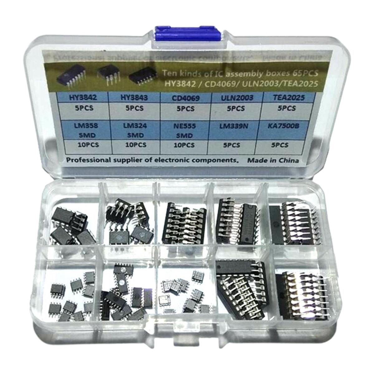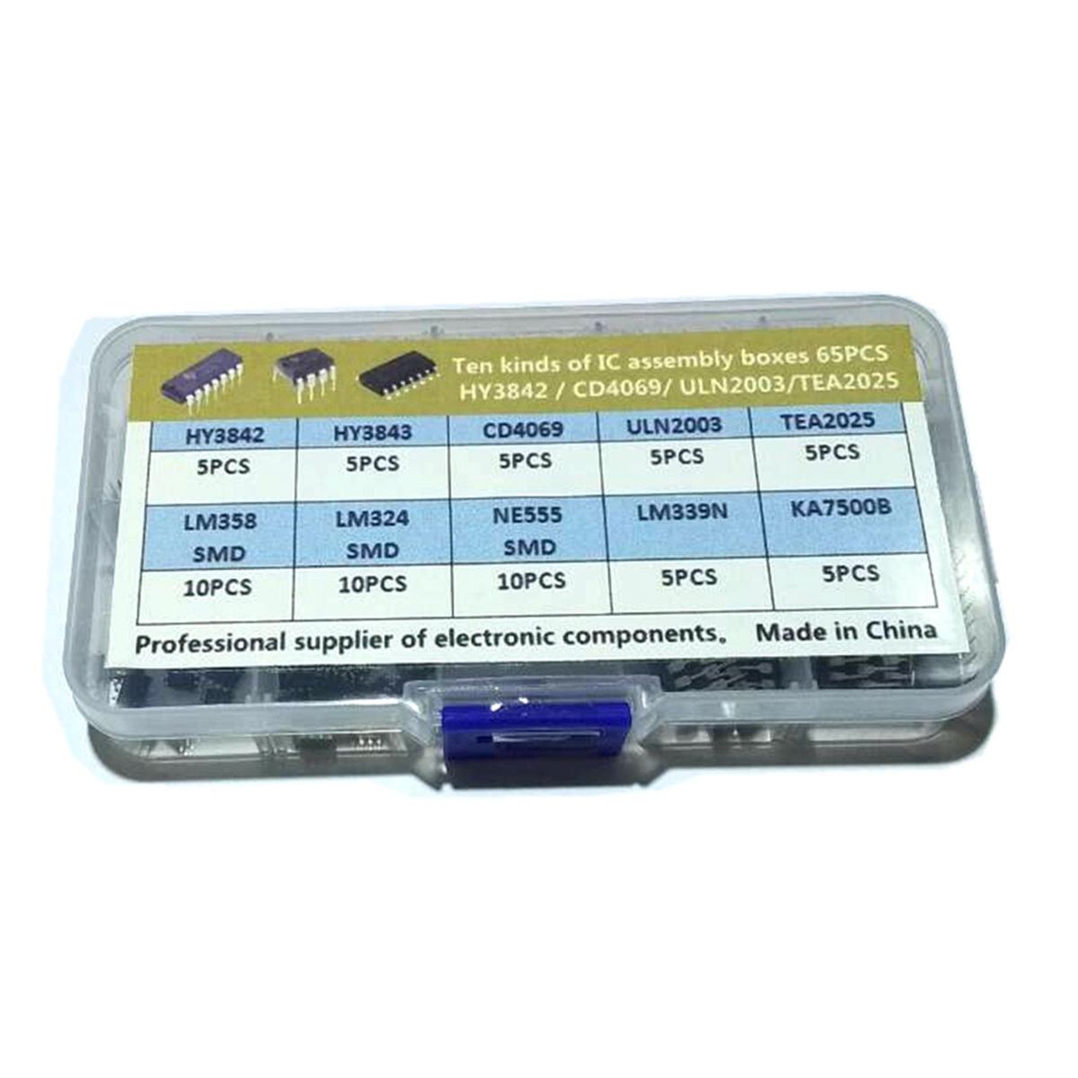 65pcs 10 Values: 5pcs HY3842,5pcs HY3843,5pcs CD4069,5pcs ULN2003,5pcs TEA2025,5pcs KA7500B,5pcs LM339N,10pcs LM358 SMD,10pcs LM324 SMD,10pcs NE555 SMD.