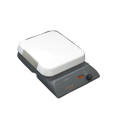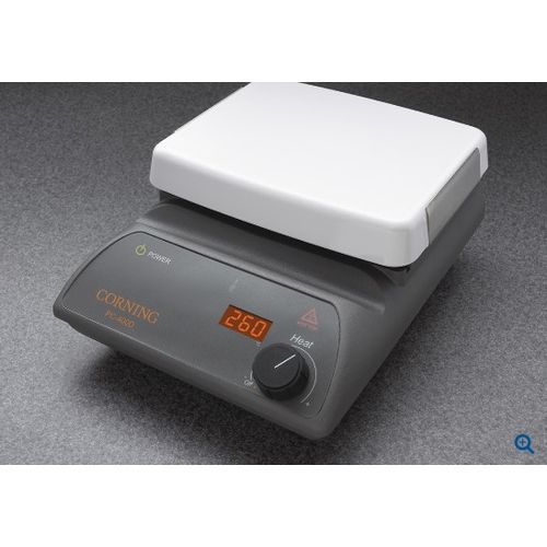 The Corning hotplate 6795-PC 600D has a digital LED temperature display in degrees C, a 10 x 10-inch glass-ceramic plate surface, a microprocessor-based temperature control unit, and a three-prong plug that works with a 100V/60Hz power source. This hotplate is used by researchers, professionals, and hobbyists to heat a variety of liquids and solutions in chemistry, food and beverage, biology, lab, and home applications.