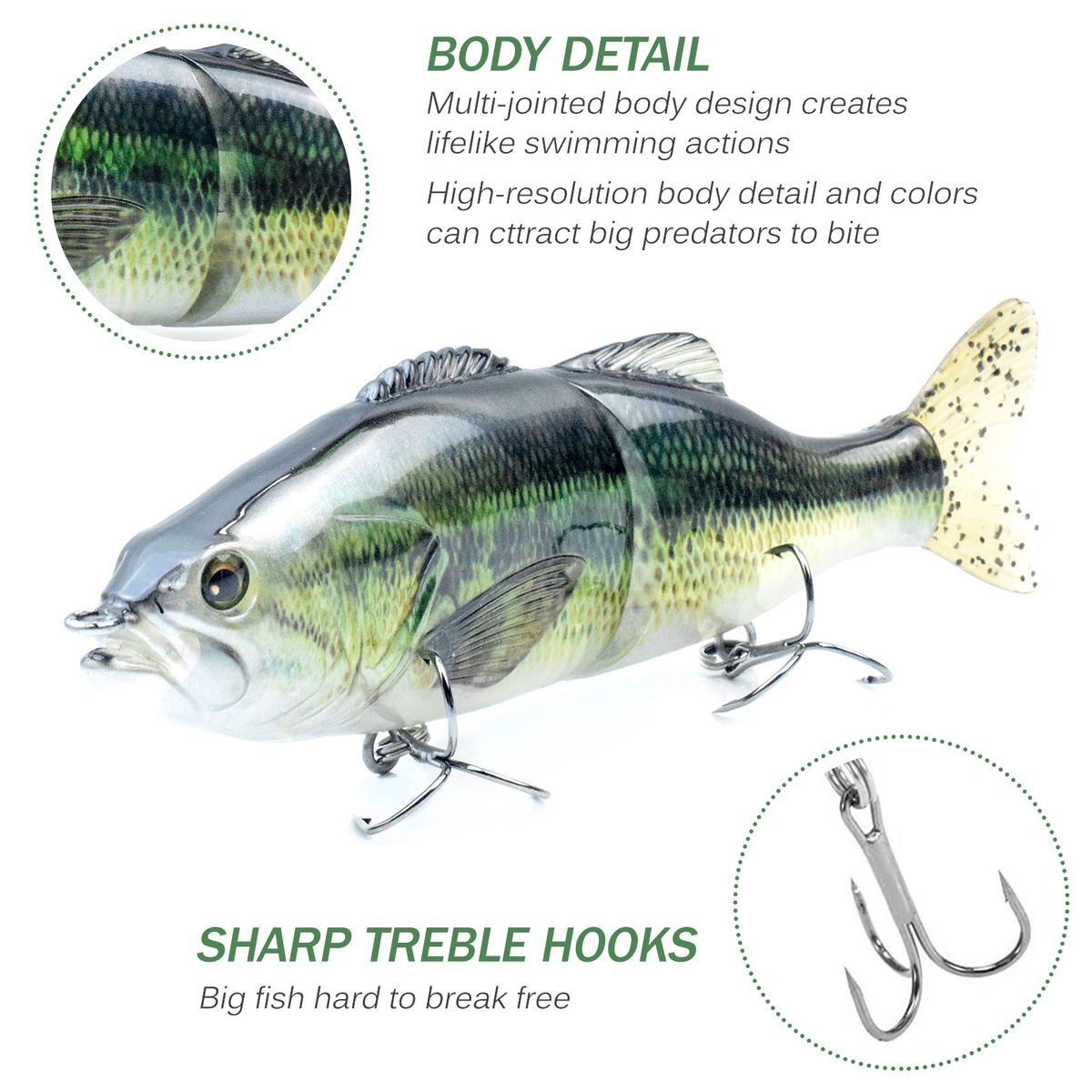 Vivid 3D eyes and realistic coating body make it looks like a real fish.