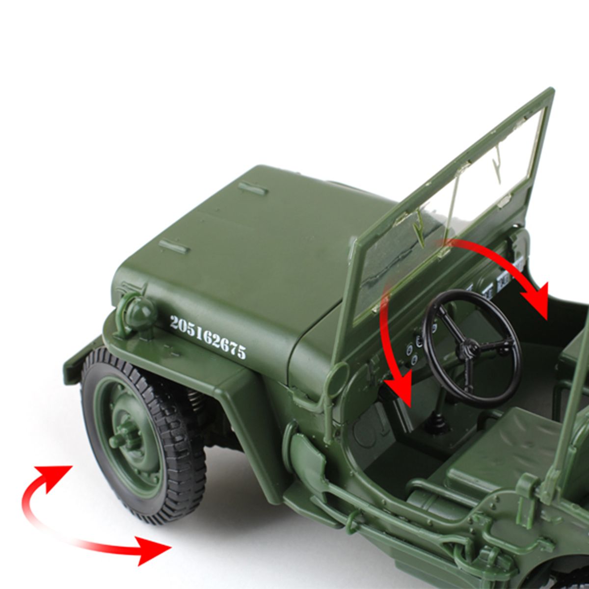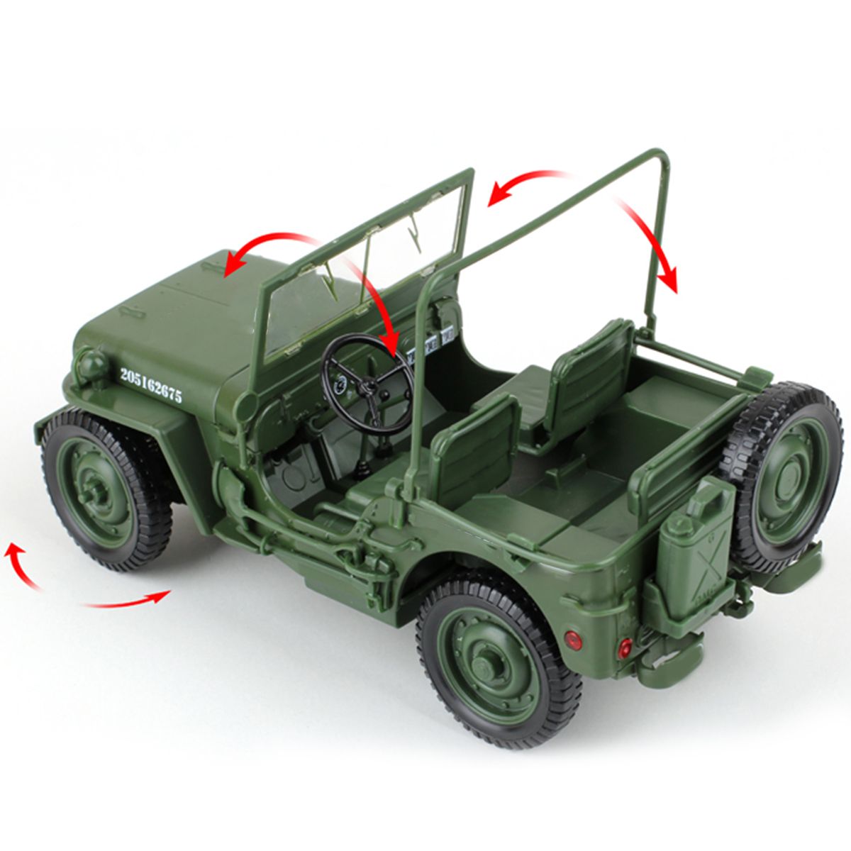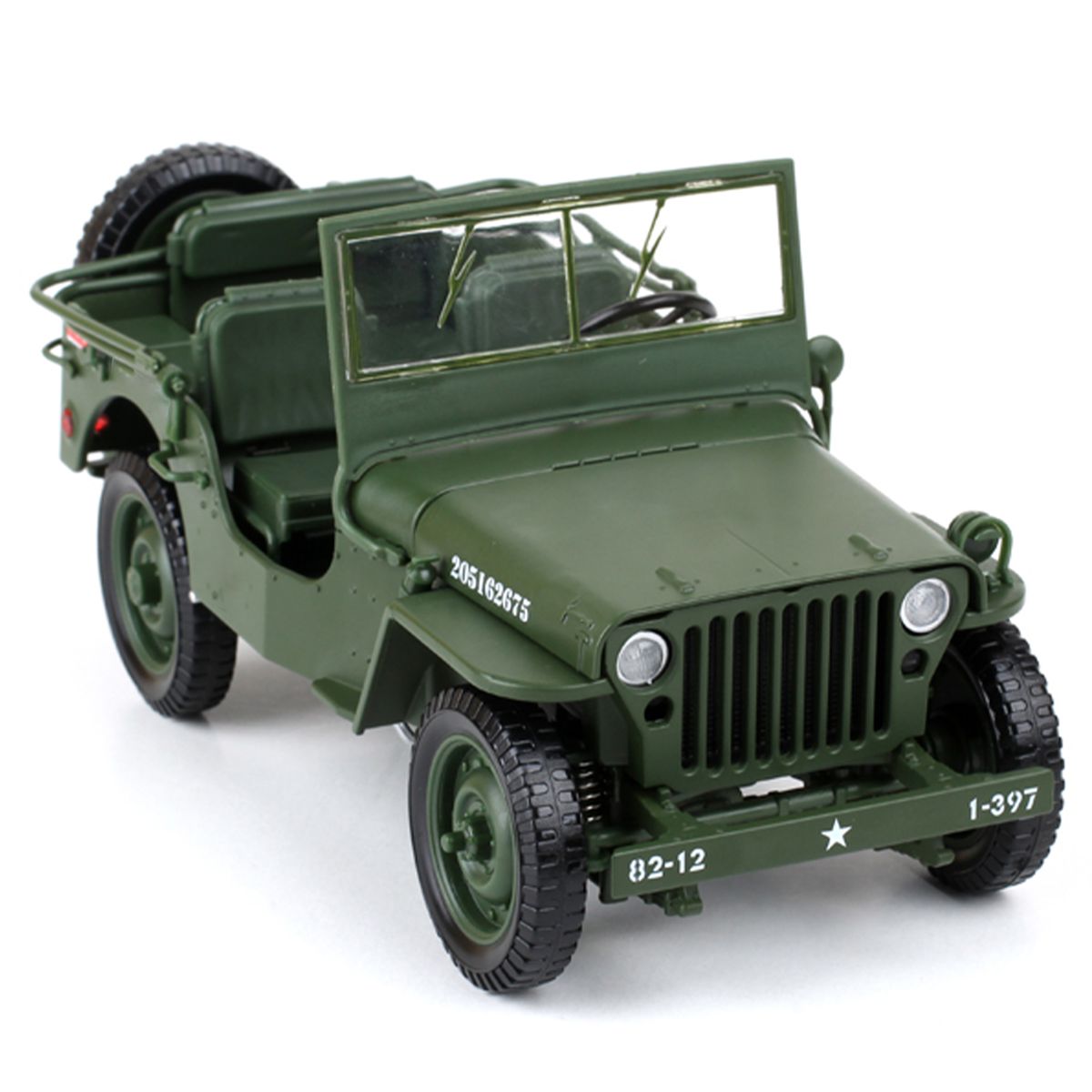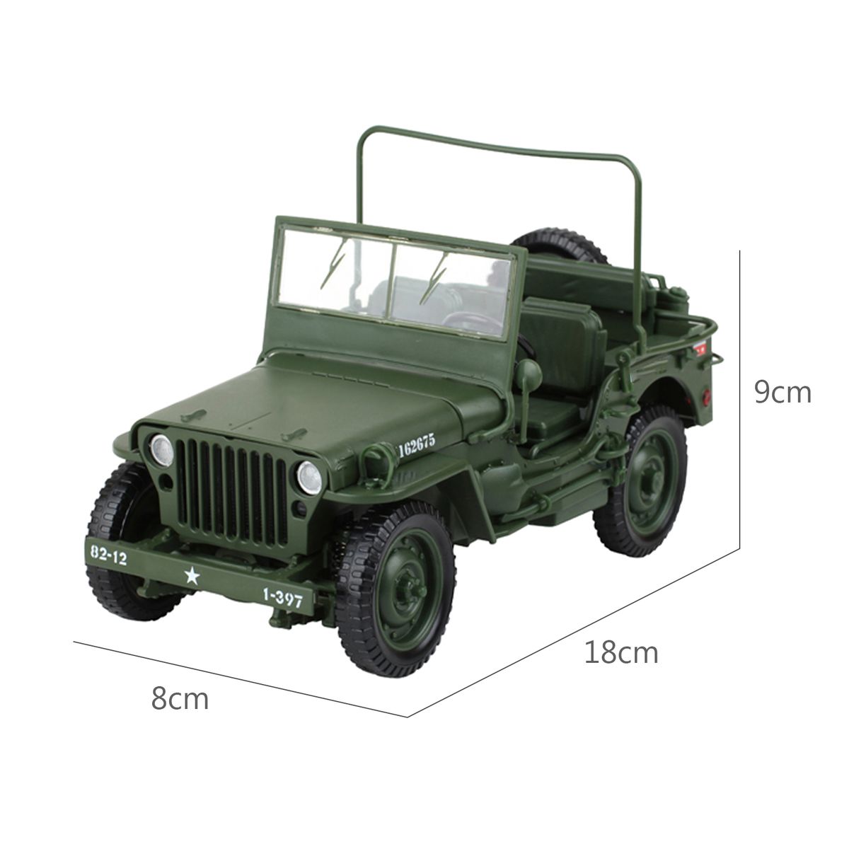 This is a 1/18 military jeep toy car. It is a good collection for lovers. Made of high-quality material, unique design. Best choice as a gift!