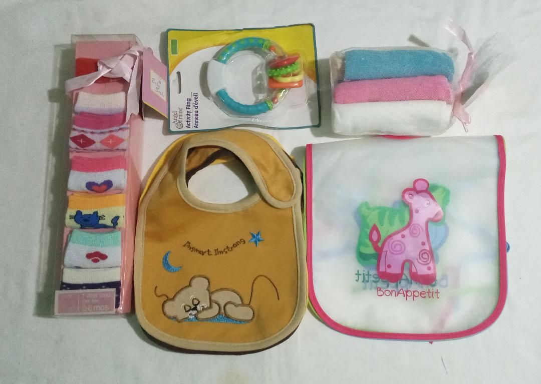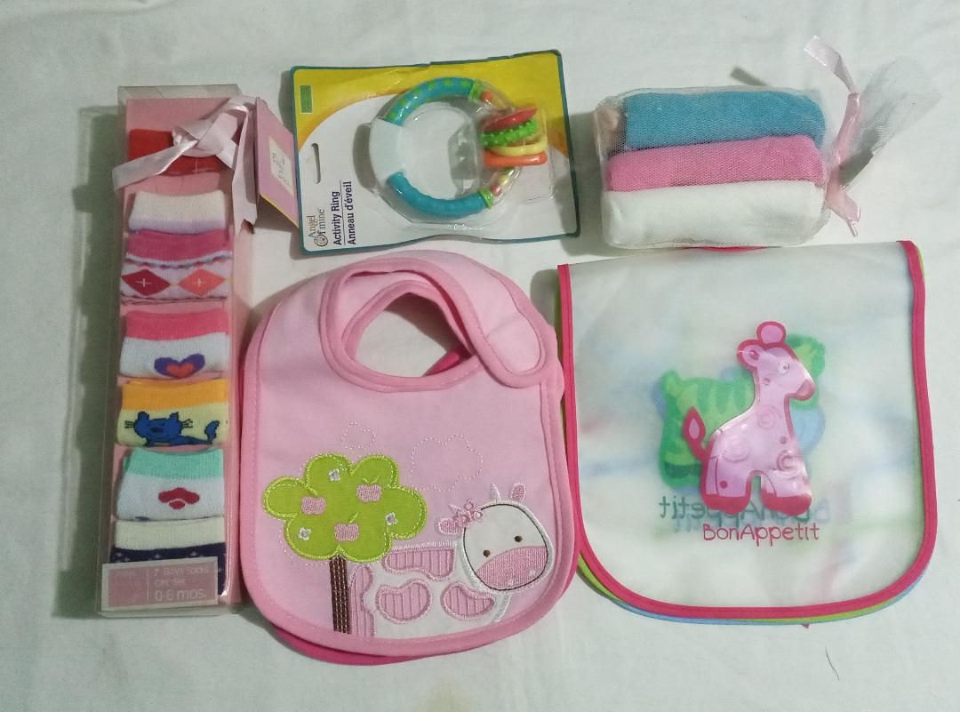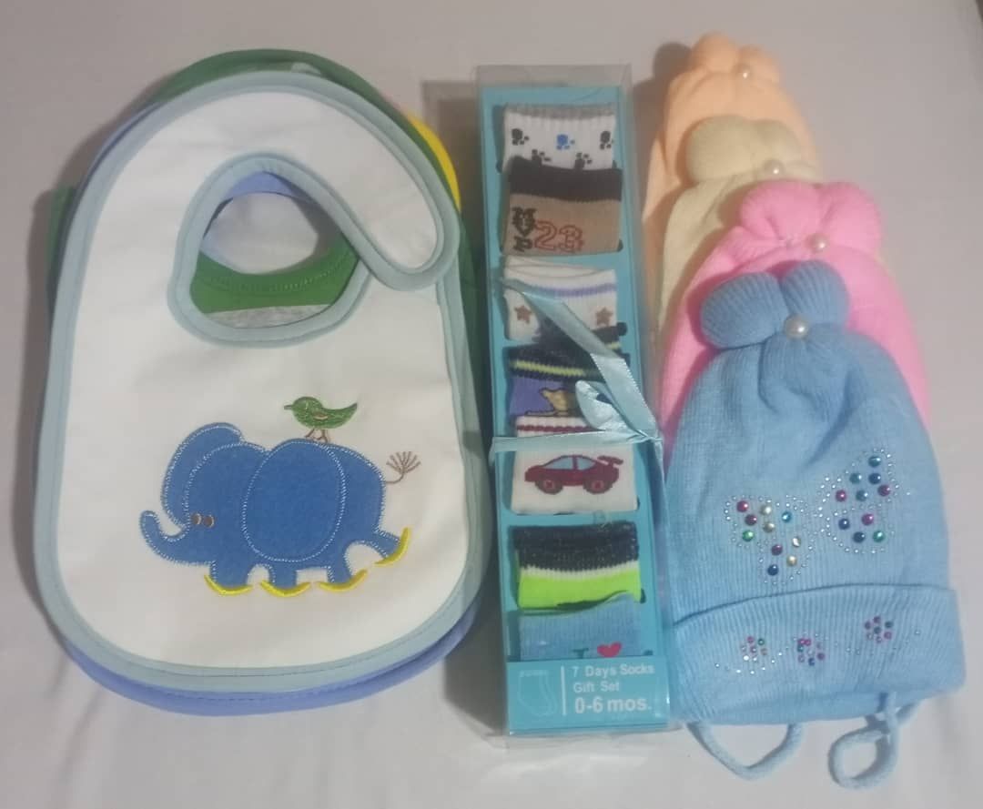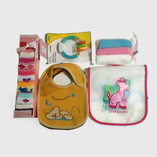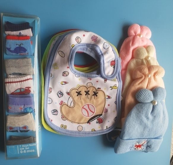 . The backside of the bibs has a plastic coating to protect your baby's clothes from getting dirty while feeding. The plastic back also makes the bibs easy to clean. It has a side velcrose faster that makes it easy to fasten around baby's neck. Baby Bibs comes in an attractive set of six (6) pieces.This pack comprises of six baby bibs made of extra soft cotton fabric. The soft fabric ensures that your baby is comfortable with the bib around his or her neck. These baby bibs are easy to wash by hand or in a washing machine, and they do not change shape even after many washes. Buy this lovely design baby bib in multiple colors for your little one and ensure that meal time is no more a messy time. Also Plastic Bib which is easy to clean and tag along where ever yoiu are going. Skin friendly 7 set of socks and and baby wash cloth for baby clean up.6bib/2plastic Bibs/7Pairs Of Socks /2 set washcloth/ rattle