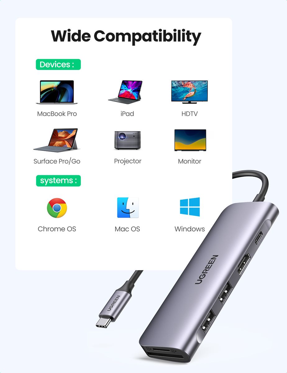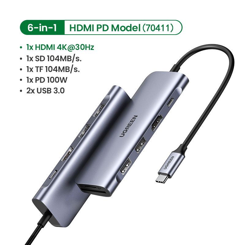 Instant Expansion: Expand more ports to connect more. UGREEN USB C Hub features a 4K HDMI output port, a Type-C PD charging port, an SD/TF card reader, and 2 USB 3.0 ports. And all hub ports can work simultaneously.