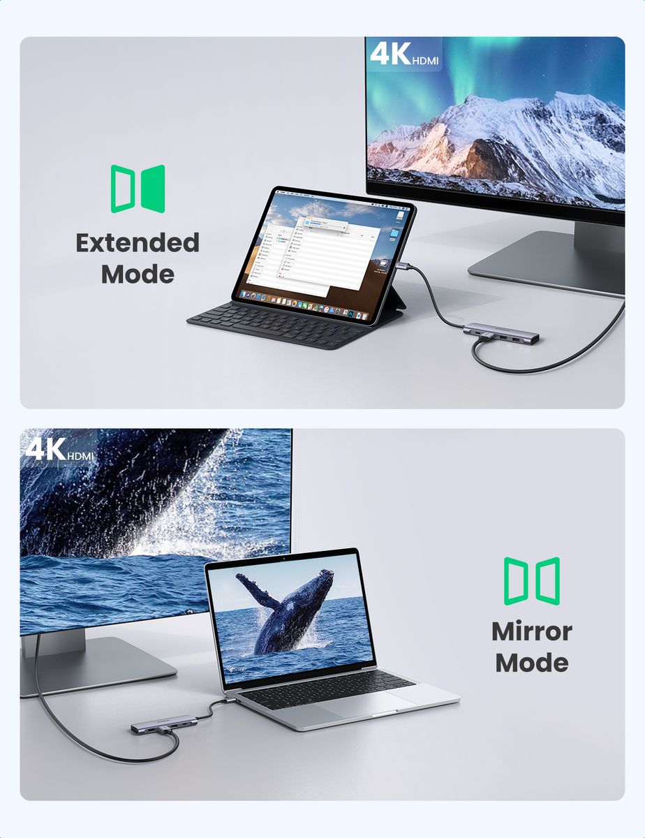 Crisp 4K Video Output: Mirror or extend the display of your laptop/phone to your TV, monitor or projector in up to 4K UHD (3840x2160@30Hz) resolution, enjoy a larger view and clear visual feast with UGREEN USB C Hub adapter. Plug & play, no need for driver installation.