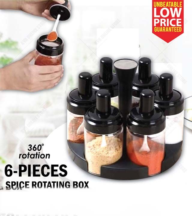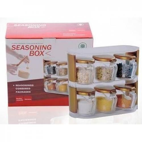 Seasoning Box - 6 Pcs Six Seasoning Boxes Six spoons One Rack Stand Comes with cover to prevent spilling Season box is transparent Material: Non-toxic Plastic Each container.Its an air tight container for storing seasonings or sipces.. Its makes your kitchen organized and arranged.. Helps you to have easy access to your seasonings anytime you need them