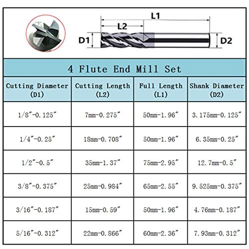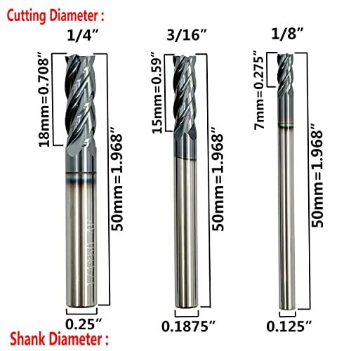 Details: Speifiations:1/2Flutes:4flutesCutting Diameter:1/2" = 0.5 inhCutting Length: 1.37 inhShank Diameter: 0.5 inhFull Length:2. inh3/8Flutes:4 flutesCutting Diameter:3/8" = 0.375 inhCutting Length: 0.984 inhShank Diameter: 0.375 inhFull Length: 2.559 inh5/16Flutes:4 flutesCutting Diameter:5/16" = 0.3125 inhCutting Length: 0.86 inhShank Diameter: 0.3125 inhFull Length: 2.36 inh1/4"Flutes: 4 flutesCutting Diameter: 1/4" =0.25 inhCutting Length: 0.8 inhShank Diameter: 0.25 inhFull Length: 1.968 inh3/16Flutes: 4 flutesCutting Diameter:3/16" = 0.1875 inhCutting Length: 0.59 inhShank Diameter: 0.1875 inhFull Length: 1.96 inh1/8Flutes: 4 flutesCutting Diameter:1/8" = 0.125 inhCutting Length: 0.47 inhShank Diameter: 0.125 inhFull Length: 1.96 inh