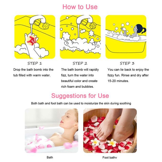Simply drop the bath into the tub filled with warm water, the bath will rapidly fizz, turn the water into beautiful color and create rich foam and bubbles. You can lie back to enjoy the fizzy fun.