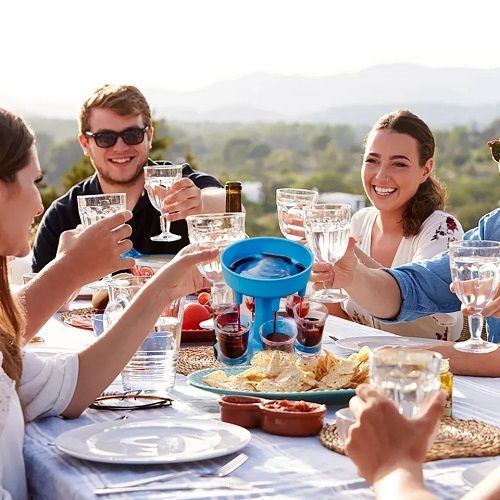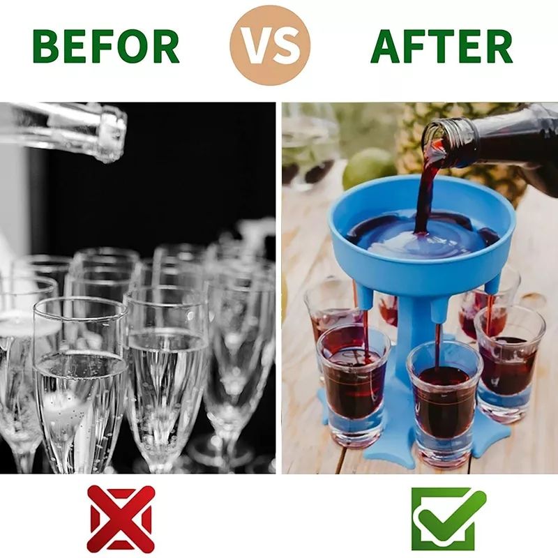 The Dispenser with six shots, allow you to easily fill up to six shot glasses at once with your favorite beverage and then hold them up, all in one!